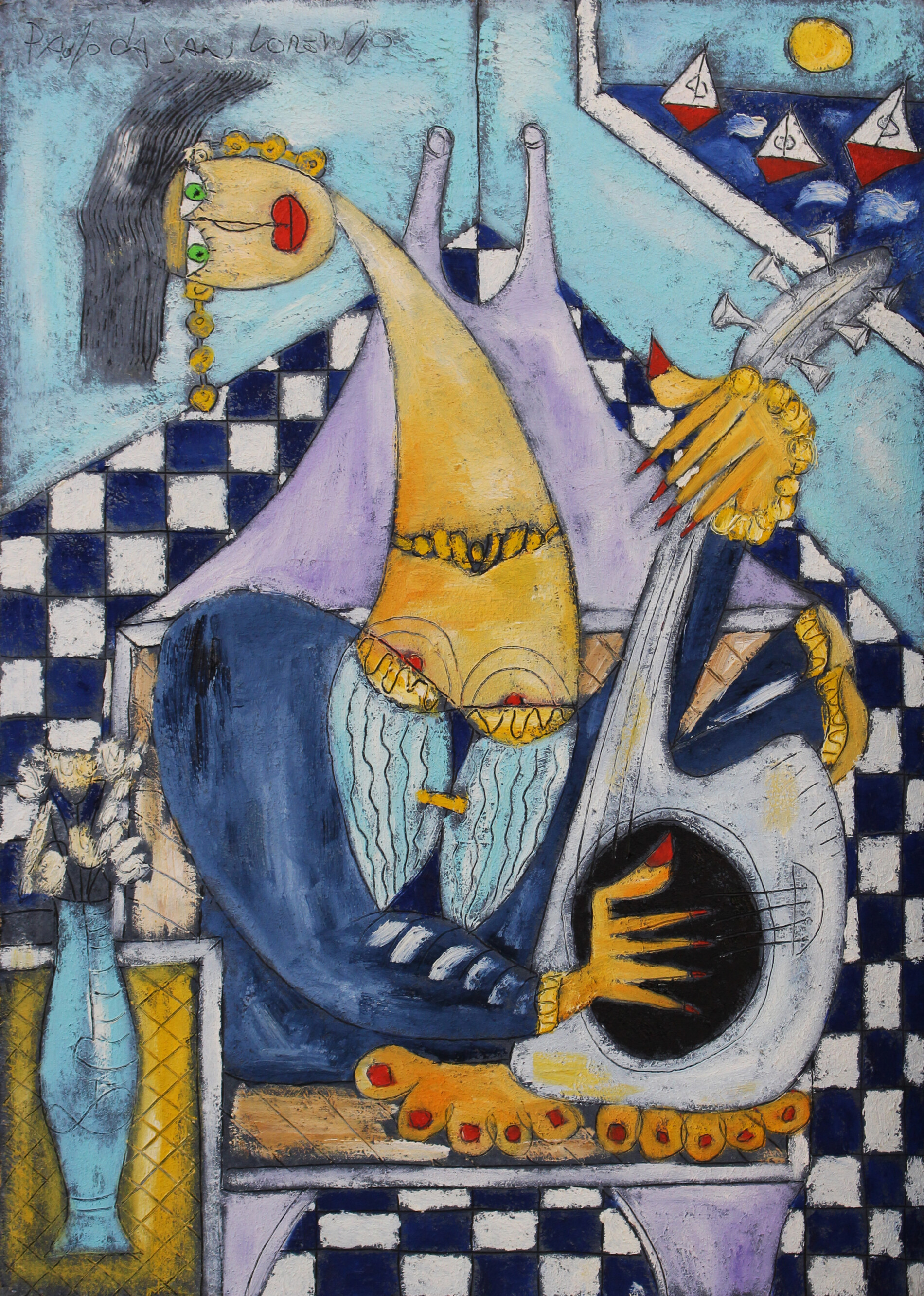 In Gitana, Paolo da San Lorenzo evokes the nomadic and mysterious figure of the gypsy woman with a rich and symbolic composition. The protagonist emerges from a background dominated by bright blues, intense blues and contrasts of yellow and white, creating a lively and suspended atmosphere. The paint appears thick and vibrant, while the scratched lines suggest movement and passion, making the image alive and pulsating. A work that speaks of freedom, identity and feminine strength.