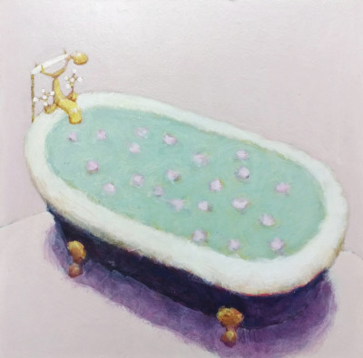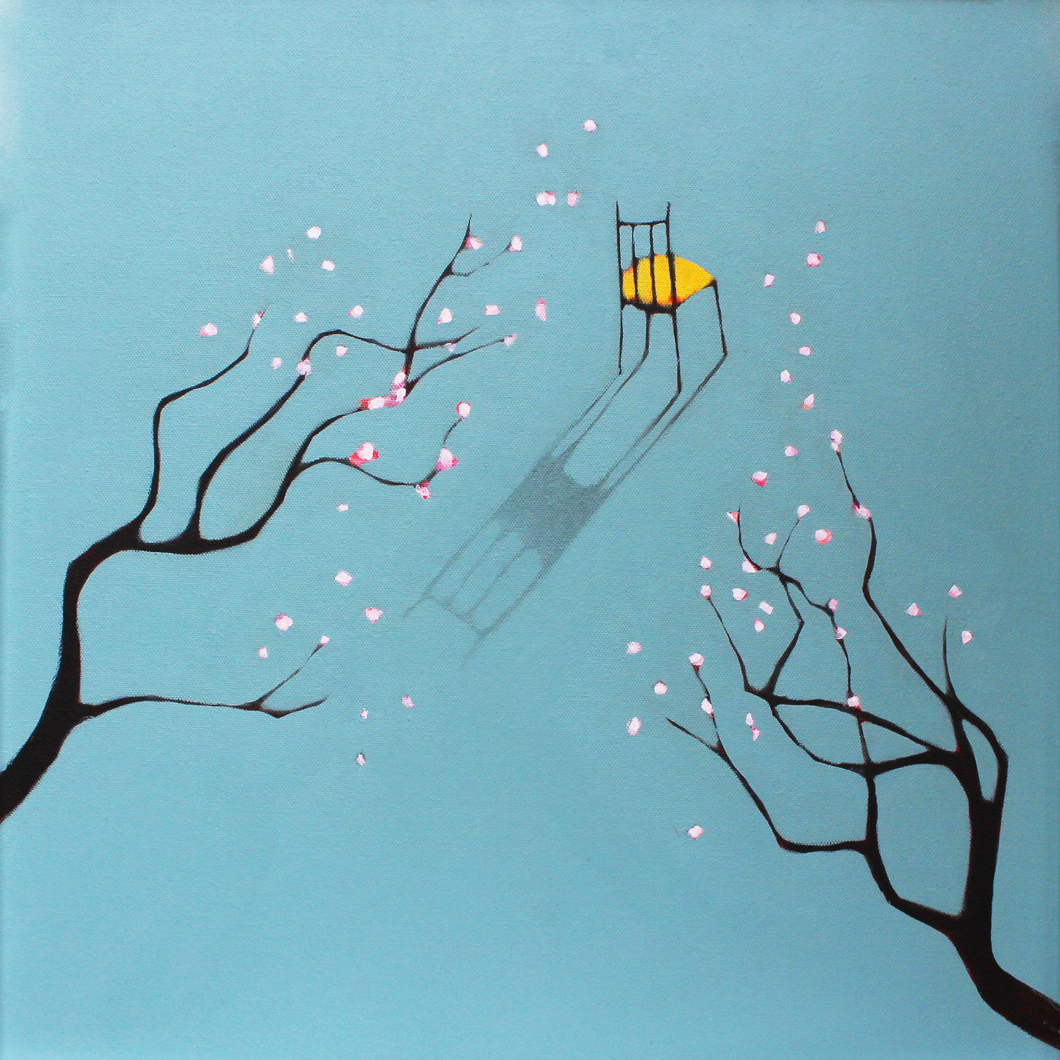 In Beth Richardson’s art, everyday objects become a starting point for deeper reflections; in this work, in tones of blue and pink, a chair suspended among flowering branches opens onto a light and contemplative dimension, leaving the viewer free to interpret.
