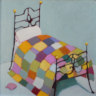 In this painting by Beth Richardson, a symphony of shapes and colors delights the viewer’s eye. In the foreground, a pair of yellow chairs—an unmistakable signature of the artist—faces a line of colorful laundry hanging out to dry. A scene of everyday beauty set against a uniform, enveloping ochre-yellow background.