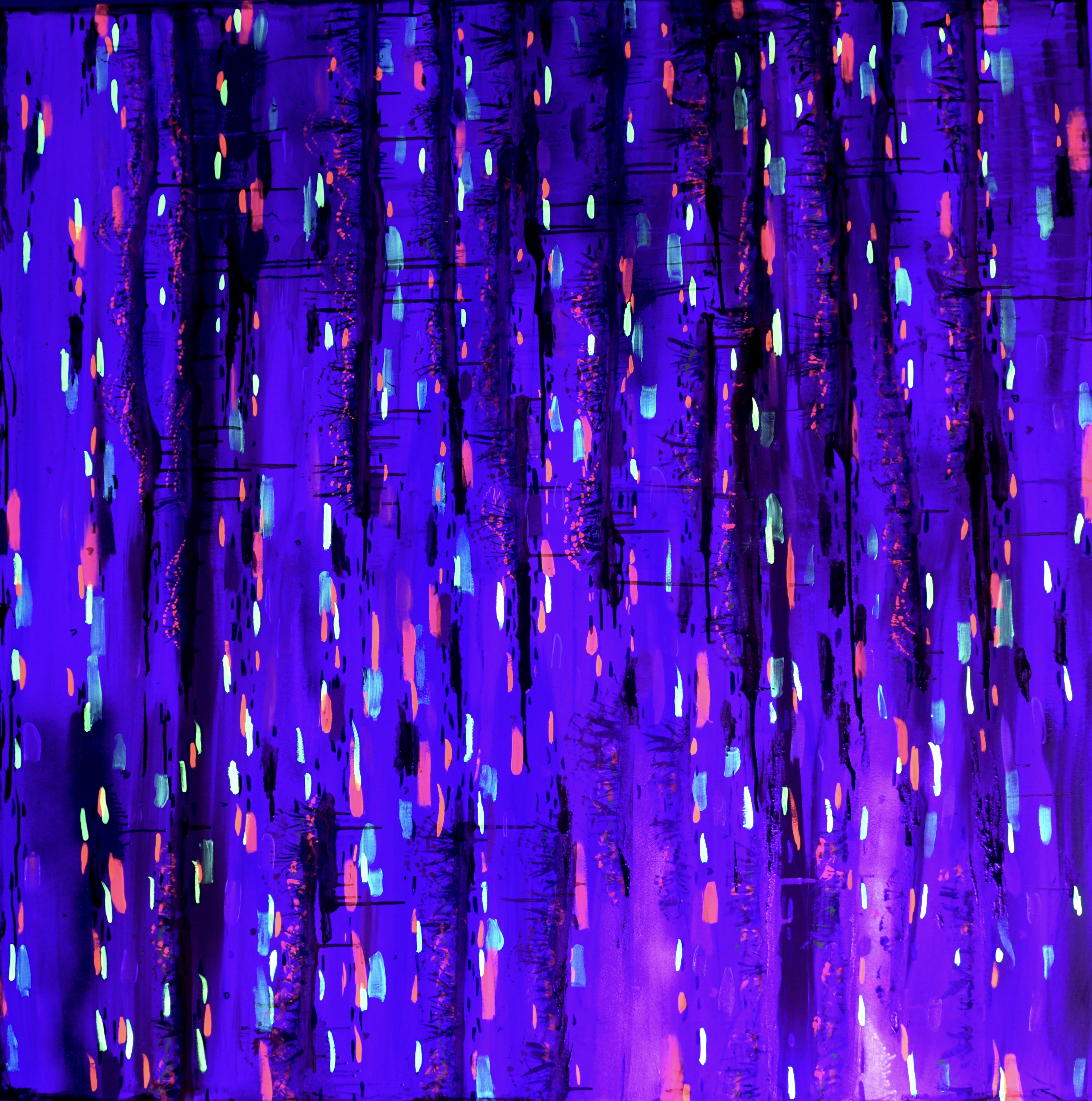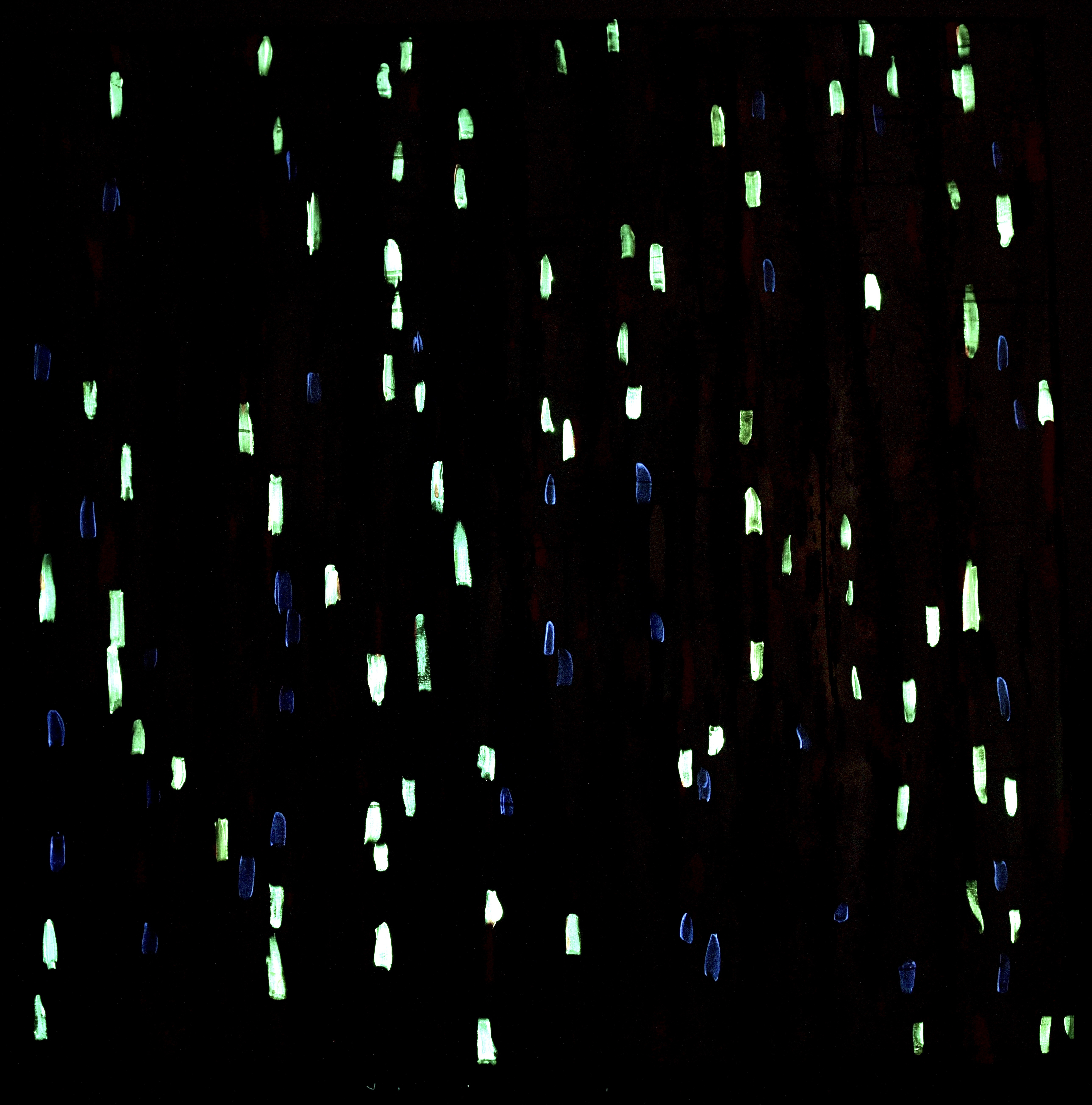 L’opera Bark dell’artista neozelandese Veronica Green richiama la trama viva e mutevole della corteccia arborea, trasformandola in un paesaggio astratto fatto di verticalità stratificate, colature materiche e vibrazioni cromatiche. Le tonalità terrose si intrecciano con innesti azzurri, rosati e fosforescenti, suggerendo una natura in continua metamorfosi. Bark indaga il rapporto tra superficie e profondità, tra ciò che la materia rivela e ciò che trattiene: i pigmenti luminescenti, emergendo nel buio, svelano un paesaggio segreto e vibrante.