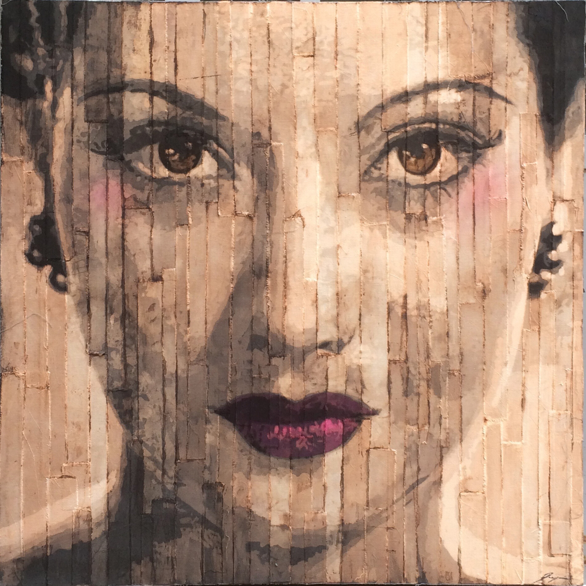 Con "Merle" l'artista italiano Gian Piero Gasparini esplora la figura femminile attraverso una composizione frammentata che unisce elementi di realismo e astrazione. La tecnica a mosaico permette una lettura complessa del volto, rivelando strati di significato e emozione. La paletta prevalente è nei toni del seppia e sembra parlare allo spettatore attraverso un ritratto fotografico di altri tempi ravvivato da alcuni intensi tocchi di colore che mettono in risalto gli occhi e la bocca della sensuale protagonista, l'attrice Merle Oberon.