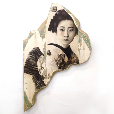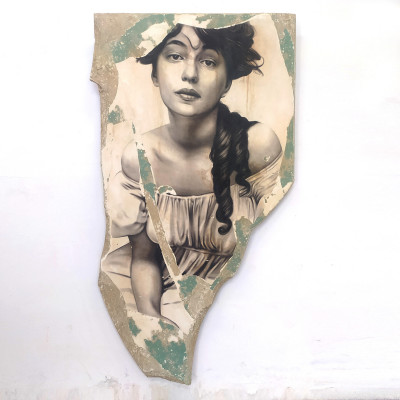 Un ritratto ipnotico e potente, dove lo sguardo della protagonista, impreziosito da dettagli pittorici raffinati, cattura e sfida lo spettatore. La pelle diventa tela per un tatuaggio intriso di simbolismo, che amplifica il dialogo tra tradizione e modernità. Il supporto frammentato e consumato dall’effetto descialbo richiama l’estetica dell’affresco, dando vita a un’opera che oscilla tra il passato e il presente, tra il corpo e la sua rappresentazione artistica.