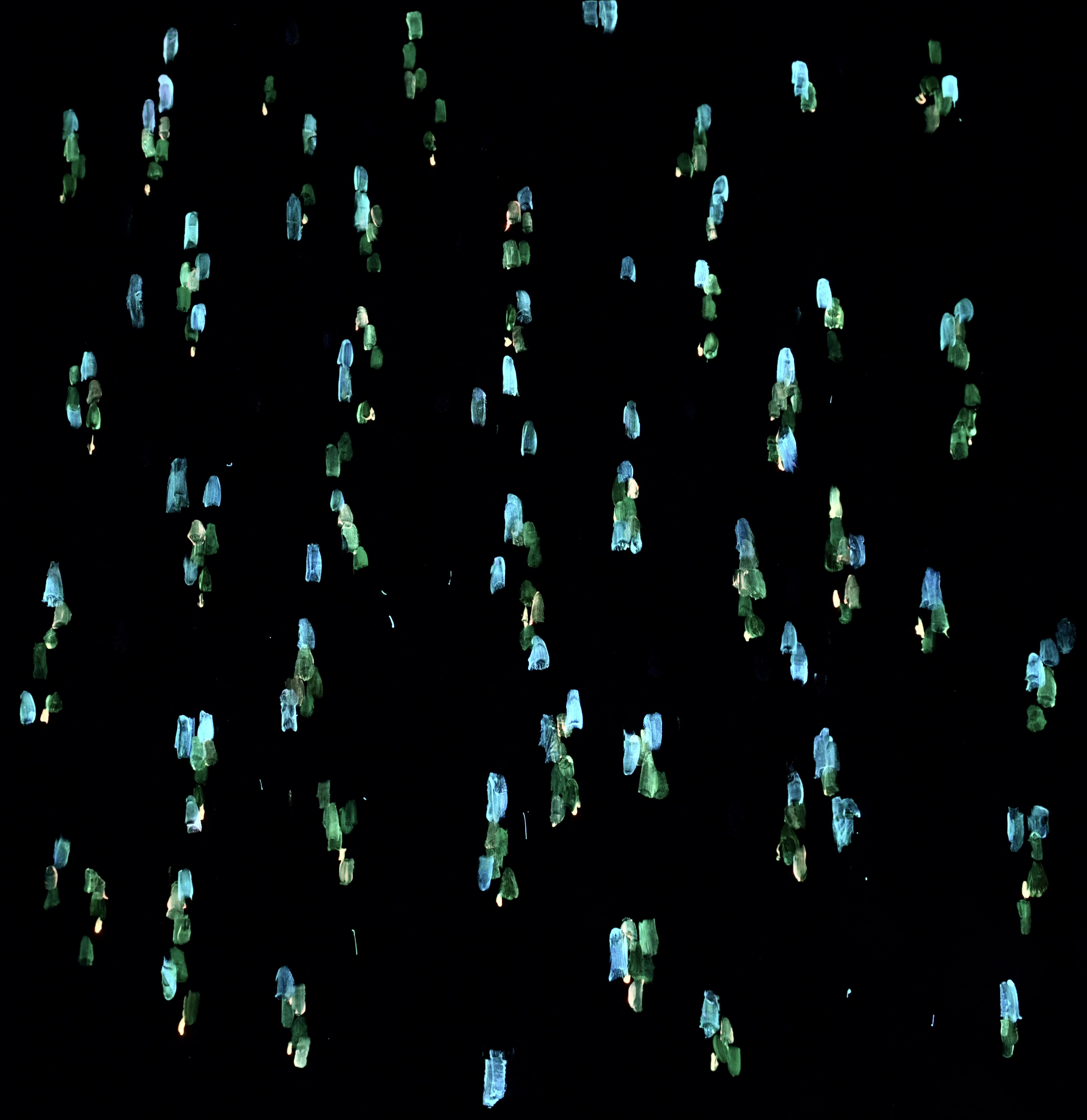In Nest, Veronica Green costruisce un intreccio pulsante di forme e cromie, un habitat visivo in cui la materia pittorica sembra germogliare e stratificarsi. Macchie verdi, rosa, viola e oro si sovrappongono come foglie, petali e frammenti organici, mentre aperture bianche interrompono il ritmo e suggeriscono spazi di respiro, varchi di luce. Il dipinto evoca un nido vegetale in continua formazione, vivo, vibrante, in cui ogni segno partecipa a un equilibrio fragile e dinamico. I pigmenti fosforescenti, che emergono nel buio, rivelano una dimensione segreta: un sottobosco luminoso che trasforma l’opera in un paesaggio notturno, intimo e pulsante di nuova energia.