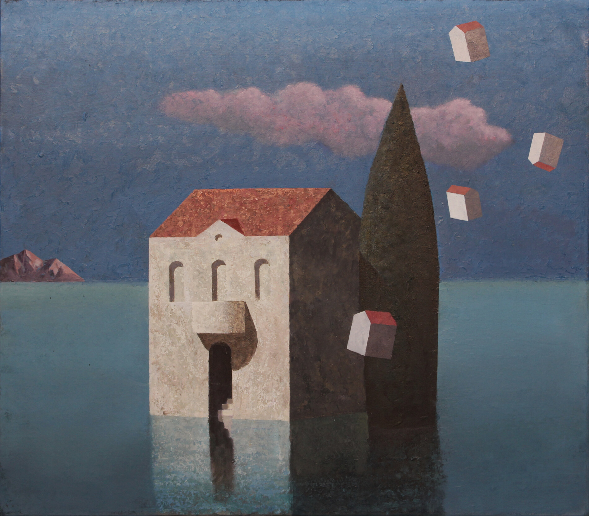 Un edificio emerge dall’acqua calma, illuminato da una luce che ne ammorbidisce i contorni e ne rivela la calma interiore. Attorno a lui, piccole case sospese attraversano il cielo come pensieri leggeri, aprendo la scena a una dimensione immaginativa e serena. Brandes crea così un luogo di silenziosa armonia, dove l’immobilità diventa possibilità e il paesaggio si trasforma in un invito alla quiete e alla contemplazione.