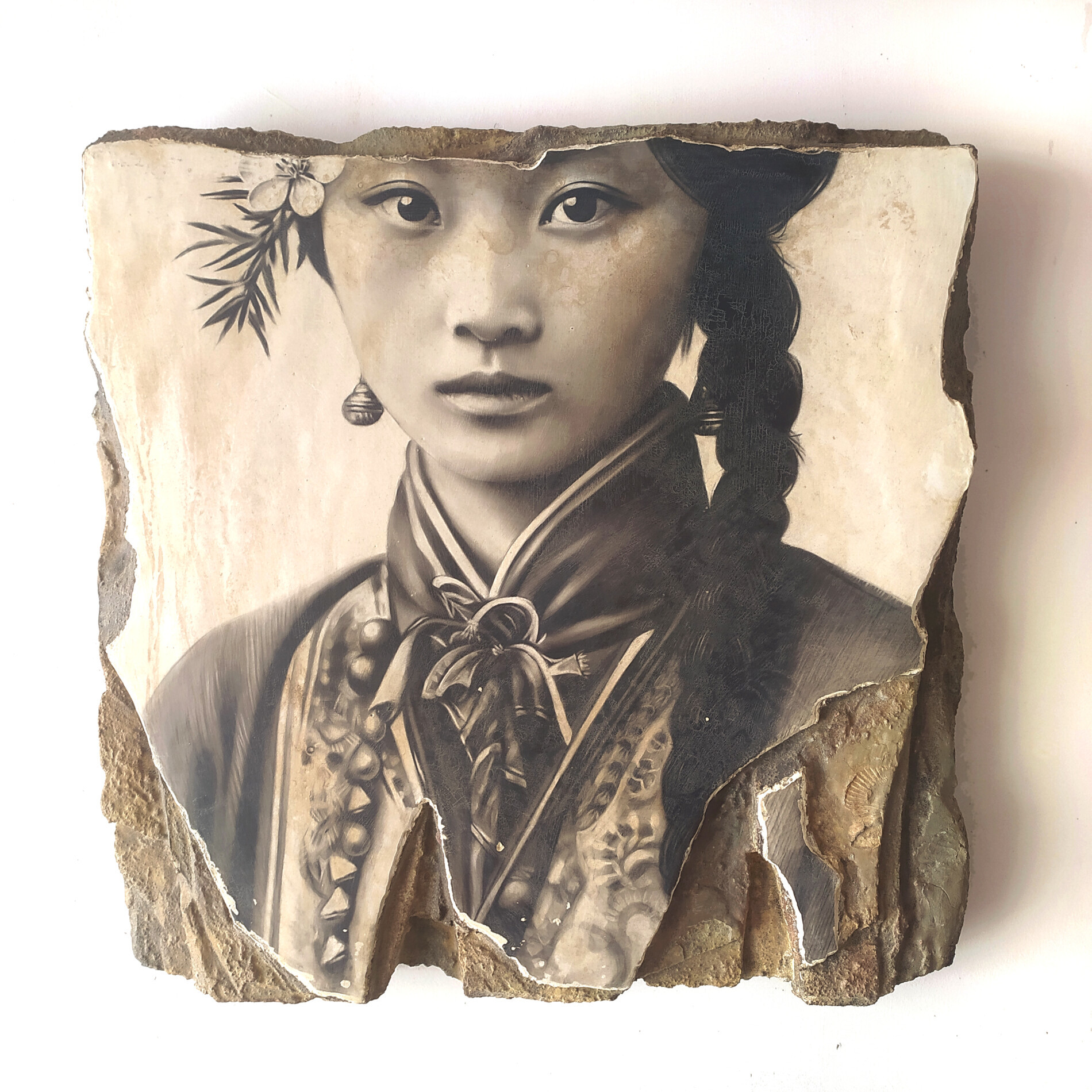 In Being and Time, Toni Alfano cattura la forza ancestrale di un’icona senza tempo. Lo sguardo ipnotico di una donna nativa americana, vestita con abiti tradizionali, attraversa la superficie consunta dell’opera, evocando un legame profondo tra passato e presente. La tecnica del carboncino, intensa e vibrante, scolpisce il volto con una profondità quasi scultorea, mentre il descialbo rivela strati di materia e memoria, come se l’immagine fosse riemersa da un muro antico. L’opera diventa così un dialogo tra essere e divenire, tra identità e trascendenza, tra la storia e lo sguardo di chi osserva.