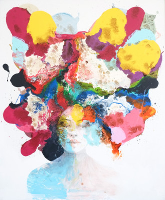 Quest’opera di medie dimensioni prende forma attraverso tre elementi che si intrecciano con fluidità: un volto etereo che emerge con una delicatezza sospesa, la colata di rossi, aranci e turchesi che si apre in forme organiche e imprevedibili, e la materia degli smalti che alterna crepe, densità e velature morbide. Insieme creano un’immagine armonica, dove il colore sembra dare corpo a un’emozione che si espande con naturalezza e trova spazio sulla tela.