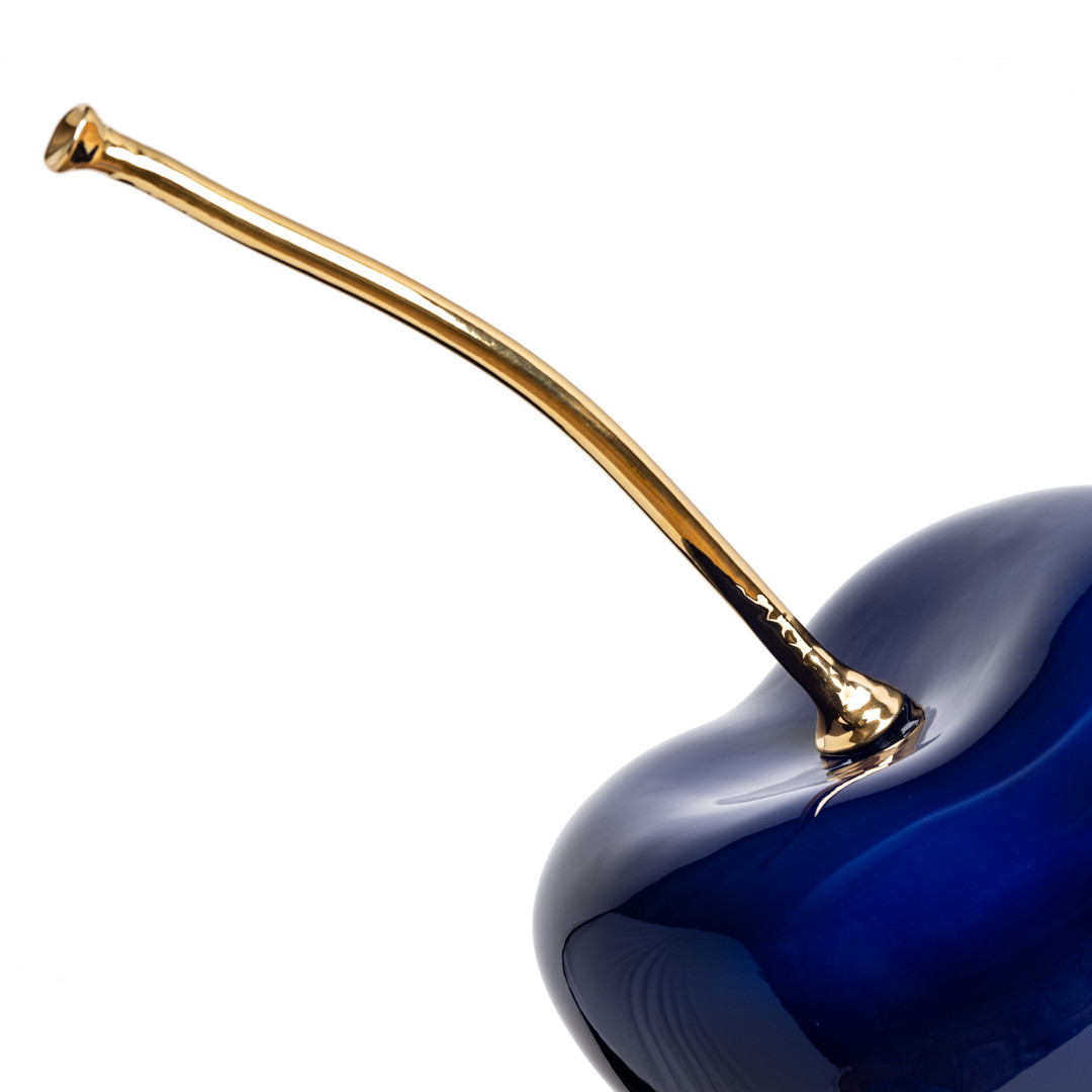 Una ciliegia di ceramica dalle tonalità blu profondo con gambo dorato: Cherry Blue è una scultura magnetica e sofisticata, capace di attirare lo sguardo e impreziosire ogni contesto. Una sintesi tra minimalismo e sensualità visiva.