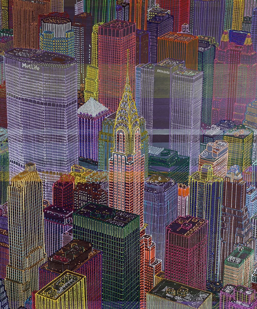 Il Chrysler Building emerge come un faro dorato nel cuore di una Manhattan luminosa e vibrante. Pietro Dente trasforma la città in una trama di linee incise, riflessi e colori elettrici: un paesaggio verticale che pulsa energia da ogni dettaglio. Il policarbonato lavorato a rilievo amplifica luci e profondità, creando un effetto quasi tridimensionale. La metropoli diventa così un organismo vivo, cangiante, che cambia con la luce e con lo sguardo. Un’opera che cattura l’essenza dinamica di New York: brillante, complessa, inesauribile.