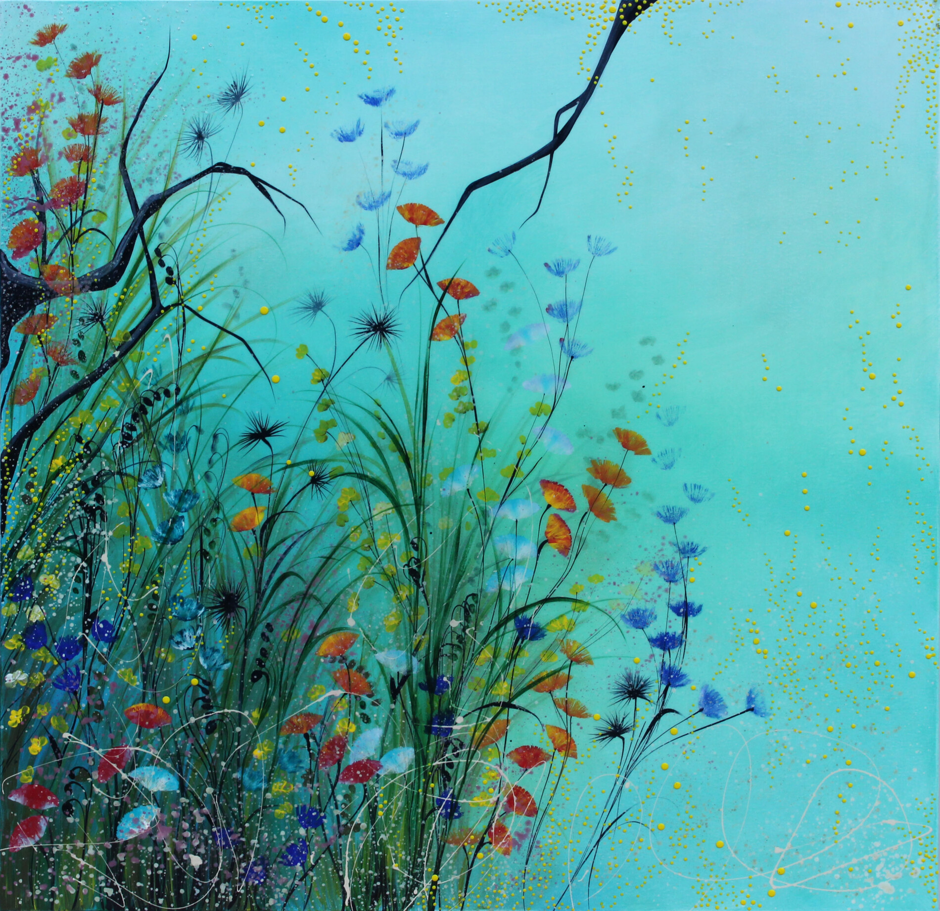 Su un fondo turchese una miriade di fiori sboccia come traccia leggera di un mondo in trasformazione. Le linee scure dei rami introducono un ritmo grafico essenziale, mentre i colori brillanti si diffondono nello spazio con naturale spontaneità. È la sensibilità di Sara Paini a guidare questa armonia: la sua pittura trasforma la natura in un linguaggio intimo, capace di evocare emozioni attraverso dettagli minimi e vibrazioni di colore.
