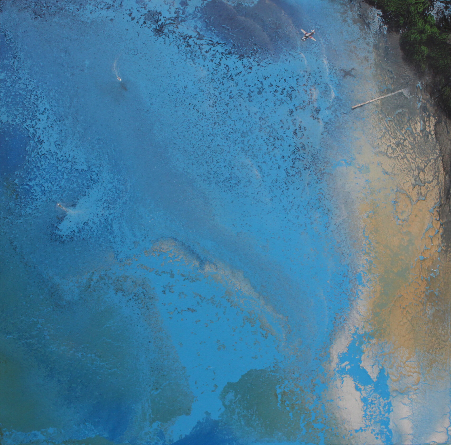 Un paesaggio marino astratto emerge da un fondo azzurro denso e vibrante. Gli elementi navigano in uno spazio mentale, scanditi da trame pittoriche che ricordano antiche carte geografiche. L’opera unisce precisione grafica e libertà compositiva.