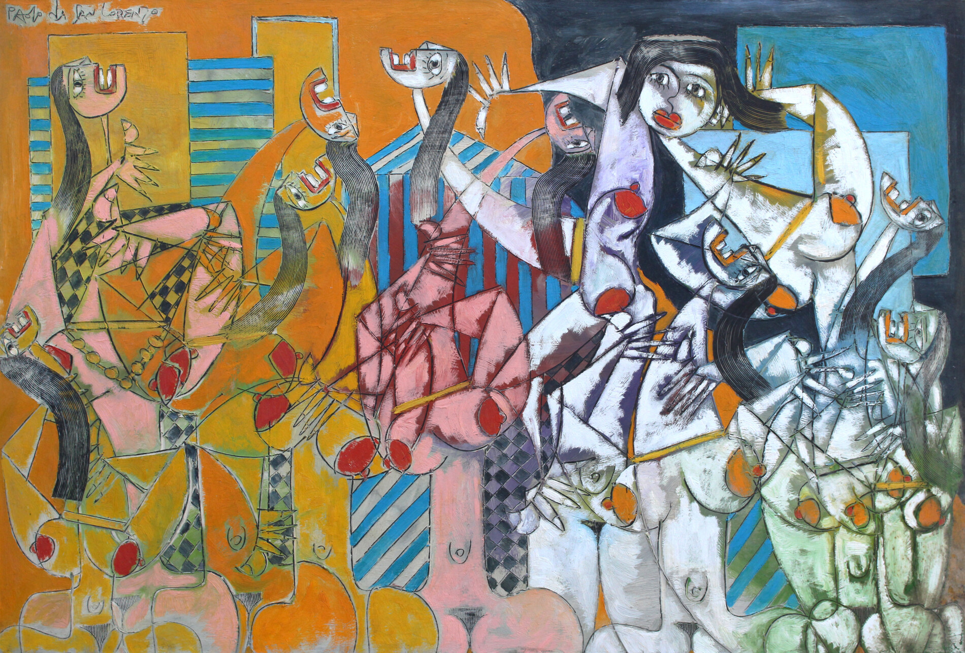 “Le ballerine del Lido” è un omaggio alla danza come espressione corporea e astratta. Le figure, appena accennate, si intrecciano in un gioco di movimento continuo. I toni predominanti sono il blu cobalto, il rosa tenue e il crema, con linee nere che scolpiscono il ritmo. L’opera trasmette una grazia sospesa, un’armonia che si dispiega come coreografia sulla tela. Un tributo poetico al gesto e alla leggerezza.