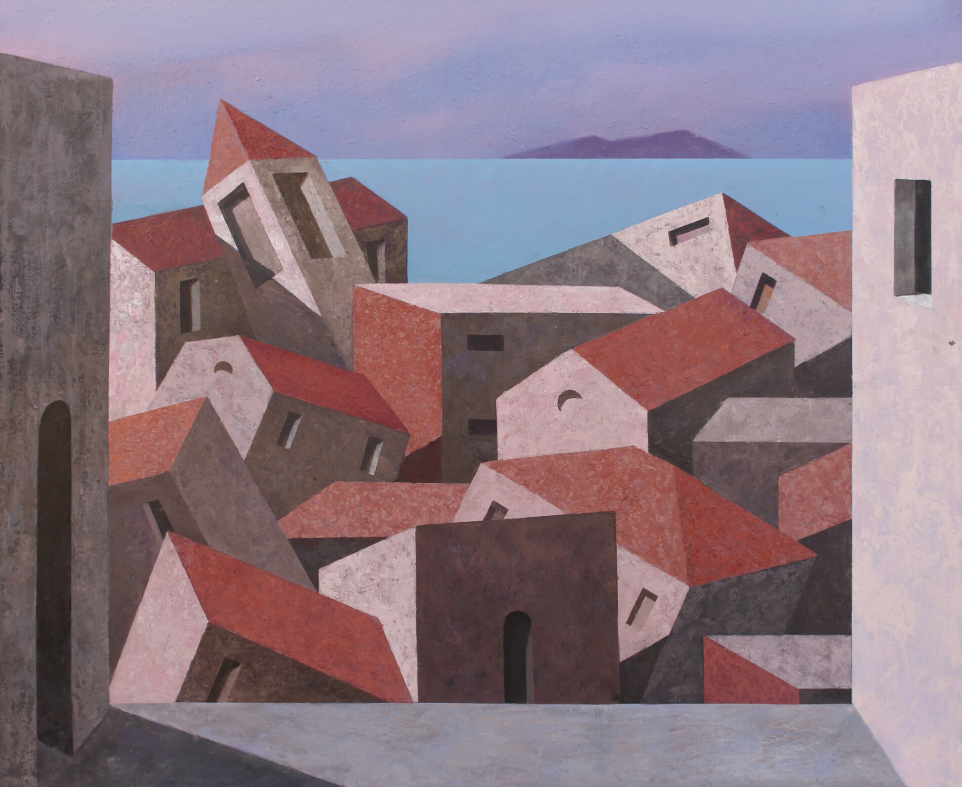 In questo grande olio su tela, Matthias Brandes ci conduce su una terrazza che si affaccia su un villaggio di case irregolari, raccolte come in un mosaico imperfetto. Sullo sfondo, un mare quieto e un cielo azzurro si incontrano in un orizzonte limpido, creando un’atmosfera serena ma anche misteriosa.