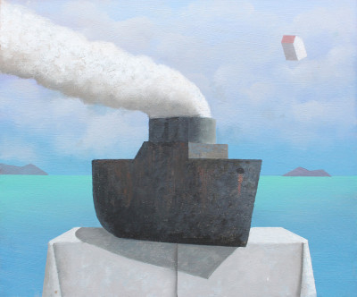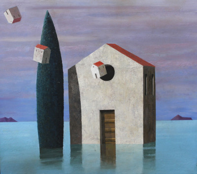 Un edificio emerge dall’acqua calma, illuminato da una luce che ne ammorbidisce i contorni e ne rivela la calma interiore. Attorno a lui, piccole case sospese attraversano il cielo come pensieri leggeri, aprendo la scena a una dimensione immaginativa e serena. Brandes crea così un luogo di silenziosa armonia, dove l’immobilità diventa possibilità e il paesaggio si trasforma in un invito alla quiete e alla contemplazione.