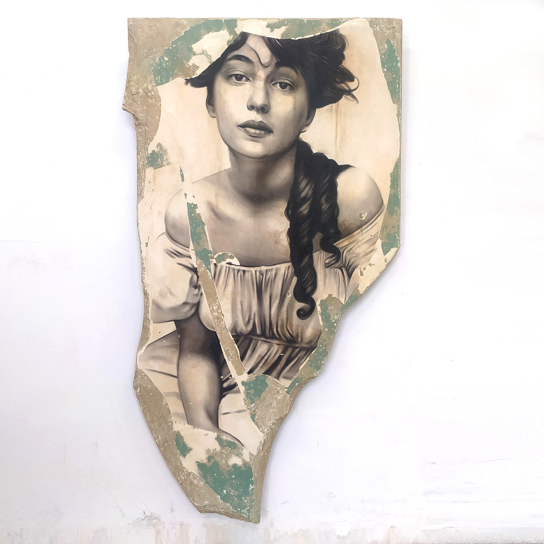 In "Phenomenologies (02-25)", Toni Alfano fonde magistralmente estetica rinascimentale e tecnica del descialbo per restituire una figura femminile di magnetica intensità. Lo sguardo profondo e diretto della protagonista emerge da un supporto frammentato, come se fosse stato strappato da un antico muro, evocando memorie sepolte e bellezze dimenticate. I toni seppia e la resa pittorica raffinata dialogano con le abrasioni della superficie, creando un potente contrasto tra fragilità e forza. Quest’opera invita lo spettatore a riflettere sulla condizione umana, dove identità e passato si intrecciano in un silenzioso atto di resistenza poetica.