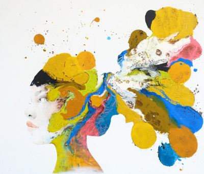 In quest’opera di grande formato, Casetti amplifica l’impatto emotivo attraverso una composizione in cui il volto, quasi dissolto nel bianco, lascia spazio a un’esplosione cromatica intensa e avvolgente. I colori: rossi accesi, gialli luminosi, blu profondi e verdi vibranti, si stratificano in campiture fluide e reazioni materiche, creando una superficie dinamica e pulsante.