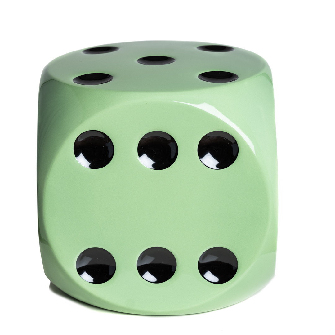 Con la sua superficie verde lucida e i puntini neri incavati, “Bluff Verde” rievoca l’iconografia ludica del dado, trasformata però in oggetto scultoreo dal fascino pop. Giorgio Laveri gioca sul confine tra gioco e arte, evocando ironia e riflessione sul caso e sulla fortuna. La brillantezza della ceramica smaltata rende l’opera un’icona contemporanea.