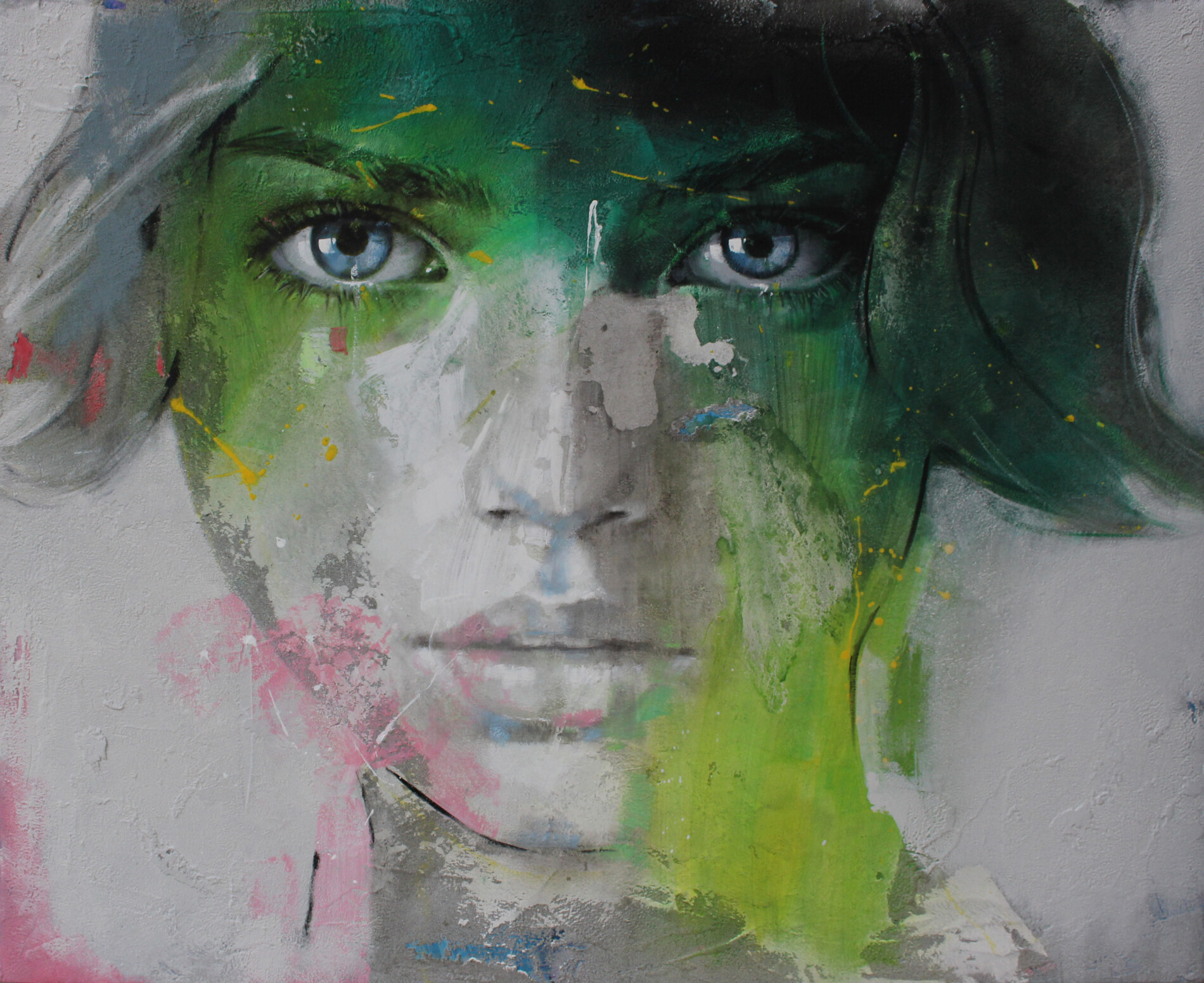 In Gemnes 12-525, Pier Toffoletti mette in scena una tensione visiva sottile tra presenza e assenza. Il volto femminile è quasi inglobato nel tessuto pittorico sugli infiniti toni del verde, tra campiture astratte di rossa, bianco polveroso e cenni dorati. La superficie materica si apre in trasparenze leggere che lasciano emergere dettagli minimi – lo sguardo, la linea del naso, un’ombra sulla guancia. Come un’apparizione, la figura esiste e svanisce a un tempo, evocando l’idea di un’identità fluida e cangiante. Un’opera che parla di mistero, trasformazione e bellezza non gridata.