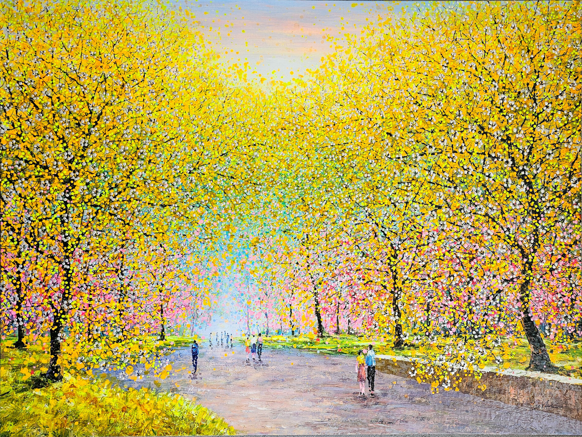 In questo luminoso paesaggio urbano, Je Shen invita lo spettatore a immergersi in una passeggiata sospesa tra realtà e incanto. Sotto una fitta volta di alberi in fiore, resi attraverso la sua tipica esplosione di piccoli tocchi cromatici, la luce filtra creando un corridoio vibrante di gialli, rosa e verdi. Le figure che percorrono il viale - discrete, silenziose, immerse nel loro tempo - aggiungono un senso di serenità quotidiana, rendendo la scena familiare e al tempo stesso poetica.