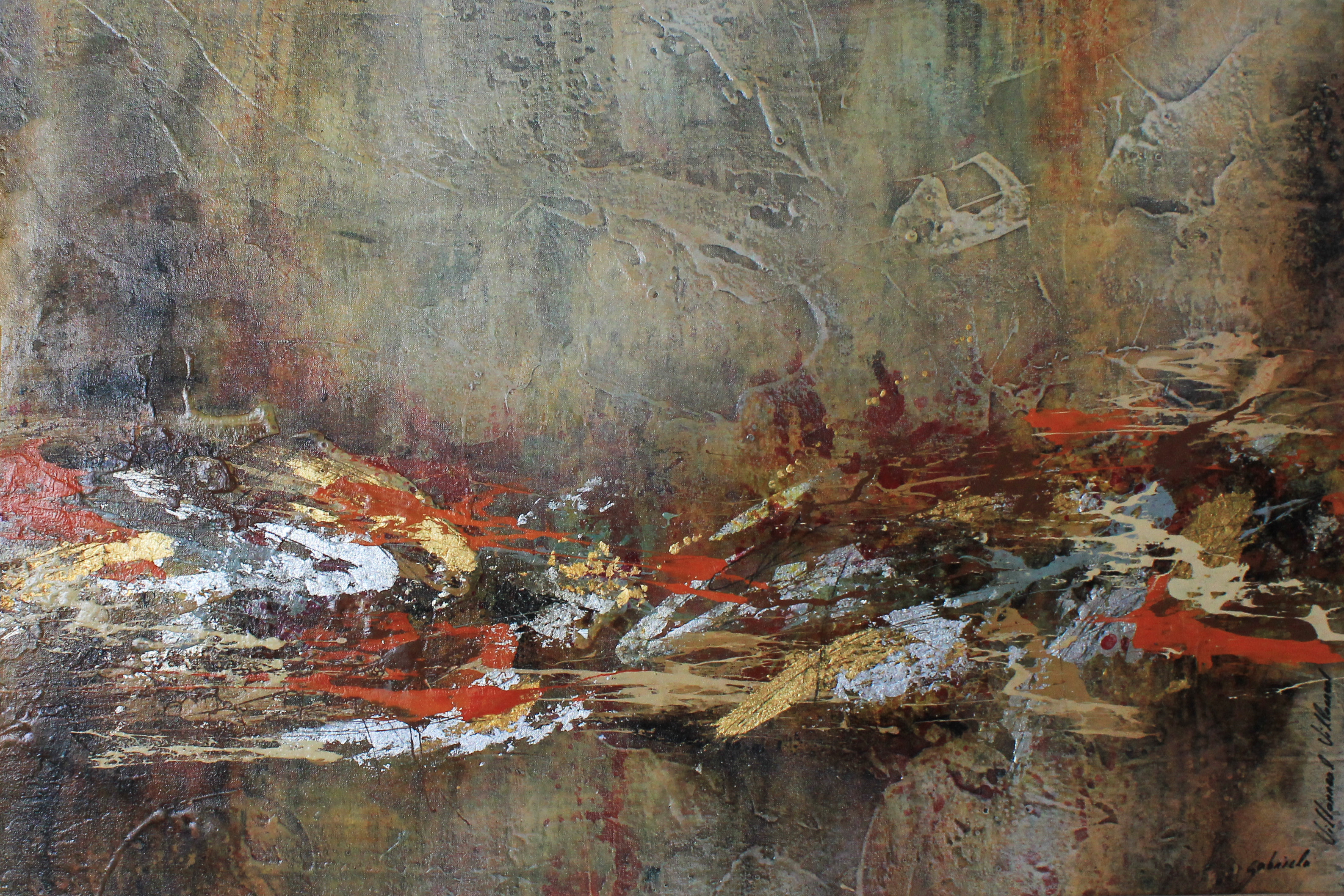 Bìneri profondi e ocra dorati si intrecciano in una composizione dinamica e con tocchi luminosi. L’artista stratifica materia e colore creando vibrazioni visive che trasformano l’opera in un paesaggio emozionale, capace di suggestionare lo sguardo.