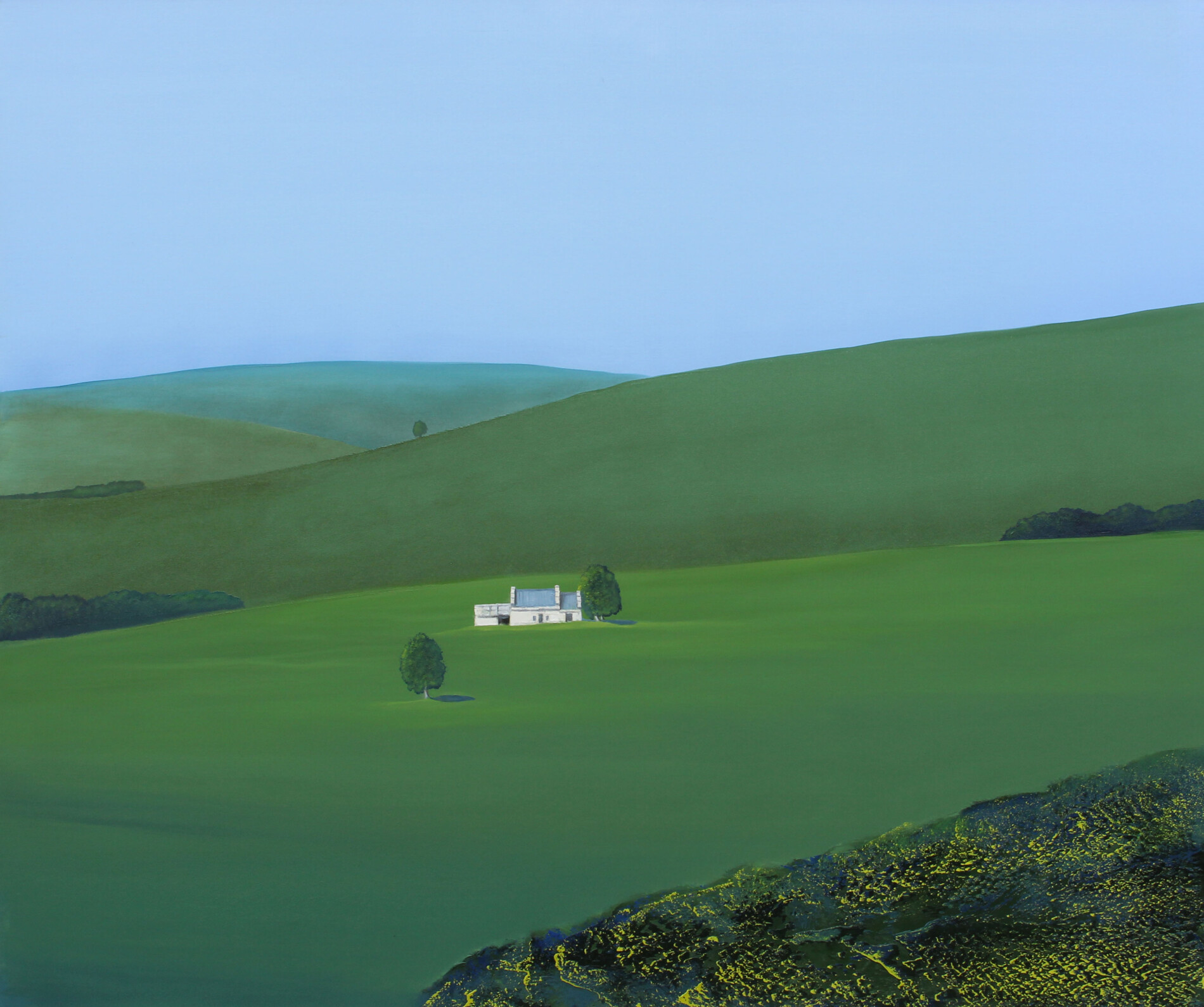 In "Lessinia" (2019), Guido Pigozzi cattura la quiete del paesaggio montano attraverso l'uso delicato dell'acrilico. Le colline verdi sono illuminate da una luce soffusa che infonde calma, mentre i toni tenui della scena rimarcano la pace dell'ambiente naturale. La trama fine e l'uso controllato dei colori rendono l'opera un invito alla riflessione sul valore della tranquillità.