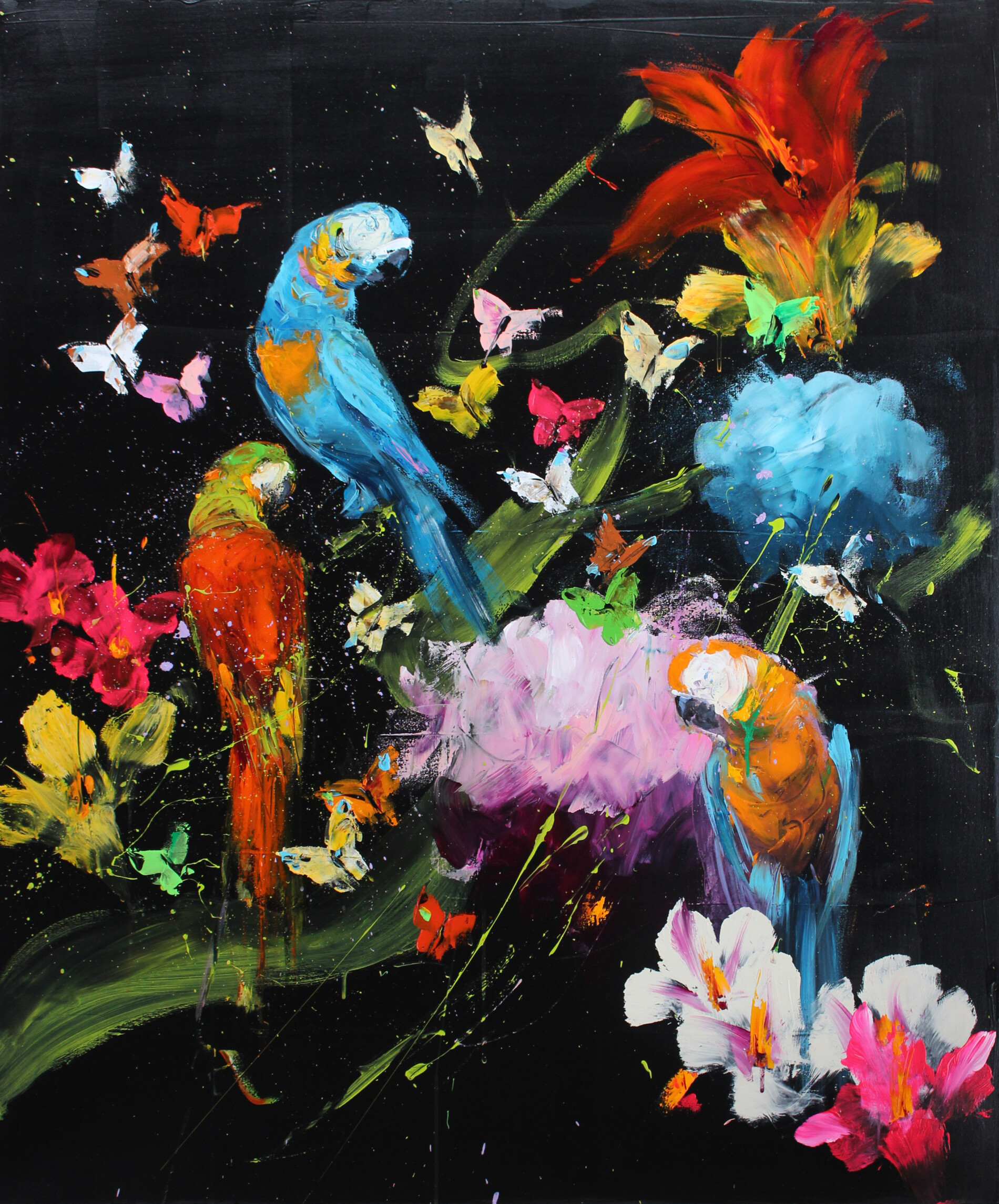 Su un fondo nero profondo che amplifica ogni bagliore, l’opera di Luca Bellandi si accende di colori vivi: pappagalli dalle piume turchesi e arancio si posano tra fiori incandescenti e nuvole di petali, mentre una costellazione di farfalle attraversa la scena come scintille in movimento. Le pennellate, rapide e luminose, trasformano la natura in una coreografia sospesa, dove ogni gesto pittorico sembra vibrare di vita propria. È una danza notturna che unisce eleganza e istinto, trasportando lo spettatore in un mondo dove luce e colore non smettono mai di muoversi.