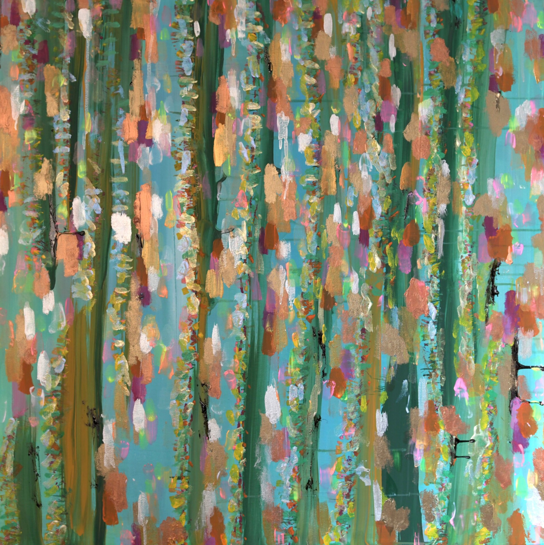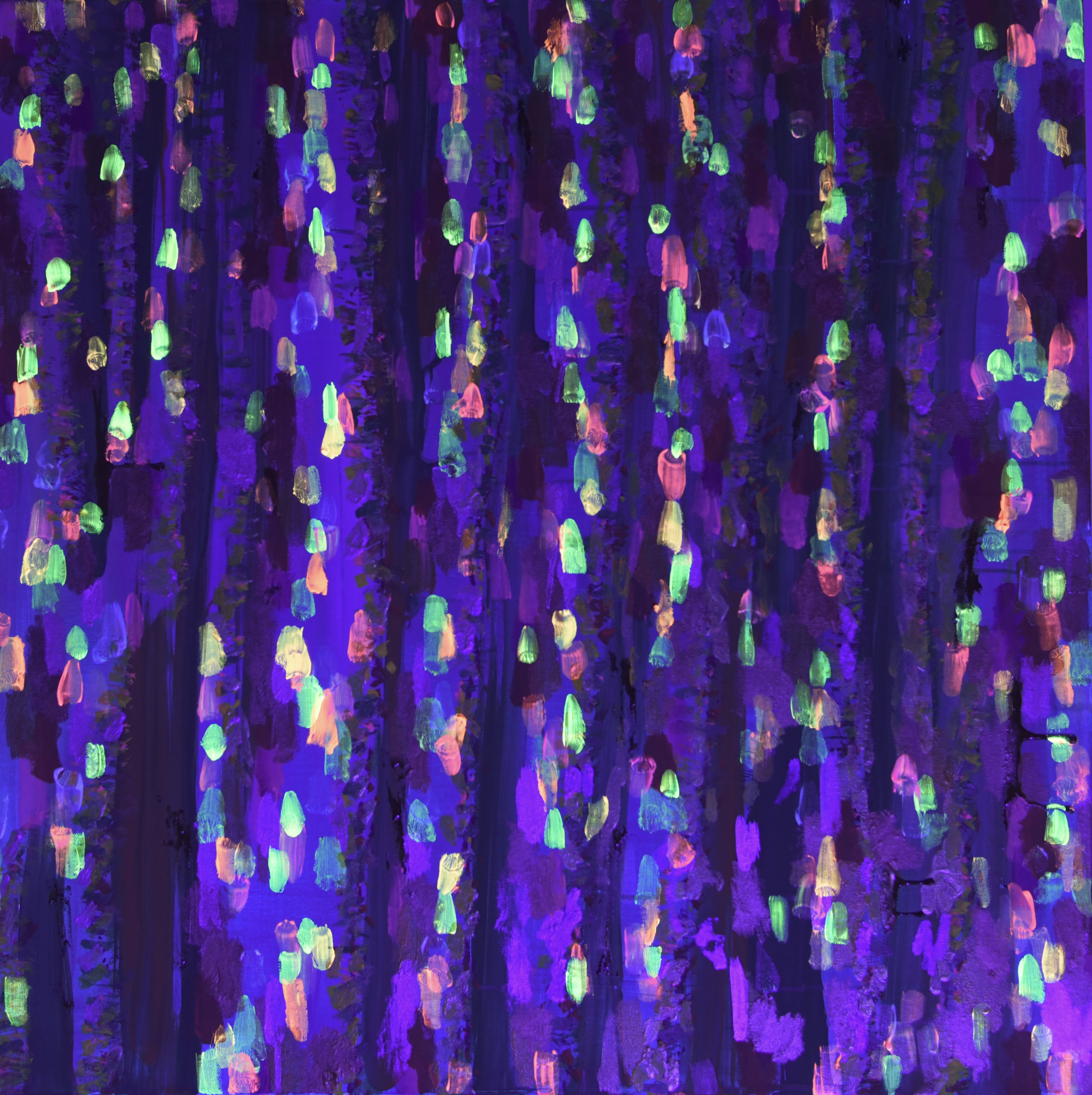 In quest’opera Veronica Green esplora il suo caratteristico dialogo tra colore, materia e verticalità. Pennellate sovrapposte, calde e fredde, creano fasce ritmiche che ricordano strutture vegetali o stratificazioni naturali. L’alternanza di tocchi metallici, segni organici e campiture turchesi genera una superficie vibrante, in costante trasformazione. Come in molte opere dell’artista, la fosforescenza introduce una seconda lettura: al buio la composizione si illumina di scie e bagliori, rivelando un paesaggio nascosto. Metal Strata offre così uno sguardo sul modo in cui l’artista neozelandese trasforma la pittura in un territorio vivo, da attraversare con lo sguardo.