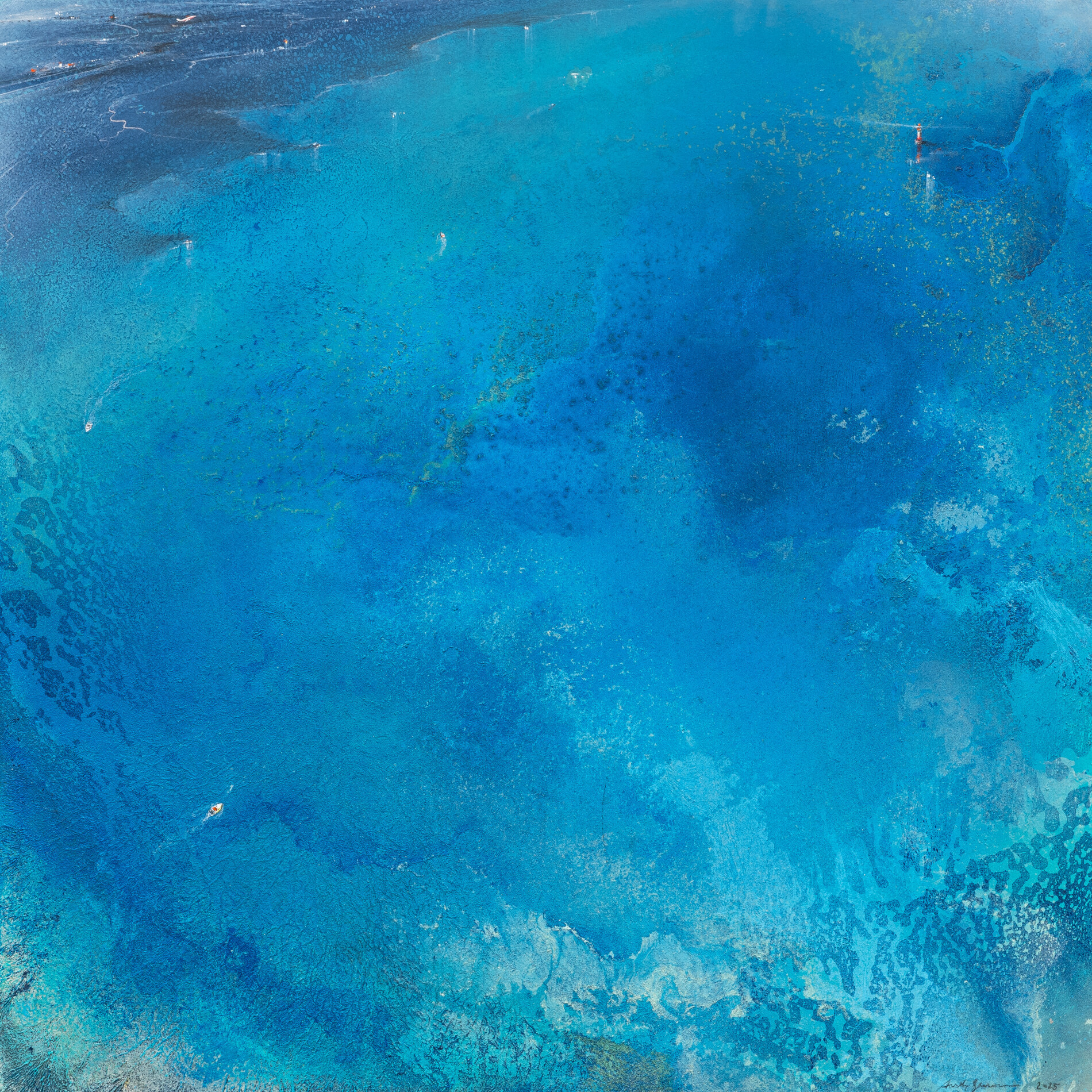 In quest’opera a tecnica mista su tela la scena si apre su un ampio ventaglio di blu che cambia intensità in modo naturale. Alcune zone risultano più compatte, altre più leggere, creando un ritmo visivo chiaro e continuo. Le piccole scie e le figure che attraversano l’acqua introducono movimento senza disturbare l’insieme, aiutando a percepire la scala della veduta. La costa, presente solo come accenno, definisce il limite dello spazio.Una composizione che cattura lo sguardo con la sua calma dinamica e con il suo equilibrio tra struttura e fluidità.