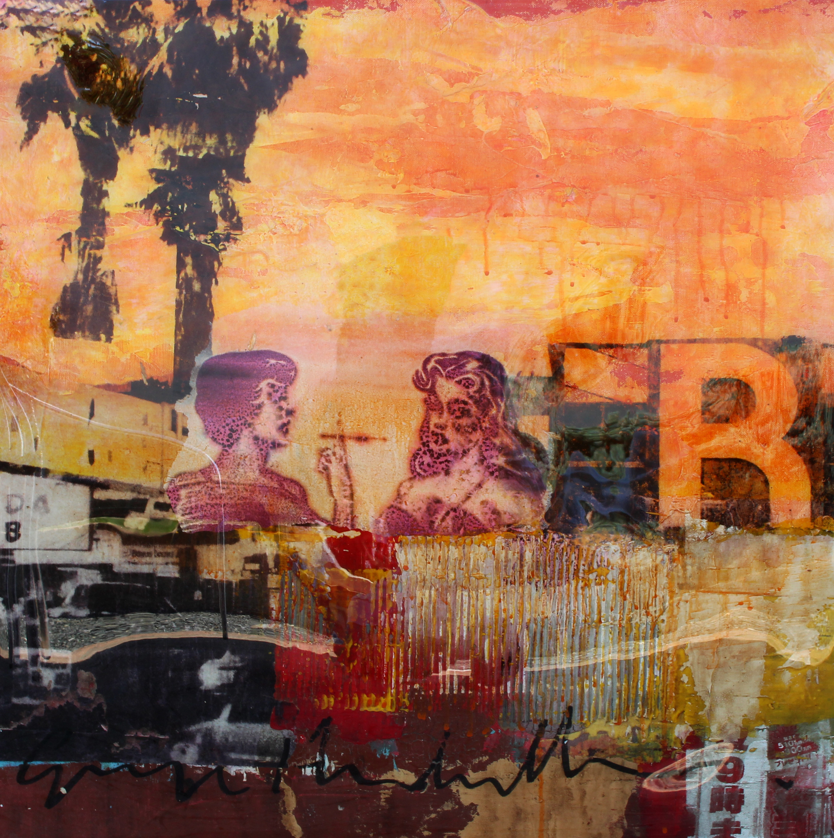 Questa opera quadrata della serie Road Trip (2016) presenta una ricca stratificazione di immagini e colori, dove dettagli tipografici e figurativi emergono in modo frammentato. L’utilizzo dell’epoxi conferisce brillantezza e profondità, trasformando la superficie in uno spazio visivo che richiama l’estetica dei manifesti urbani.