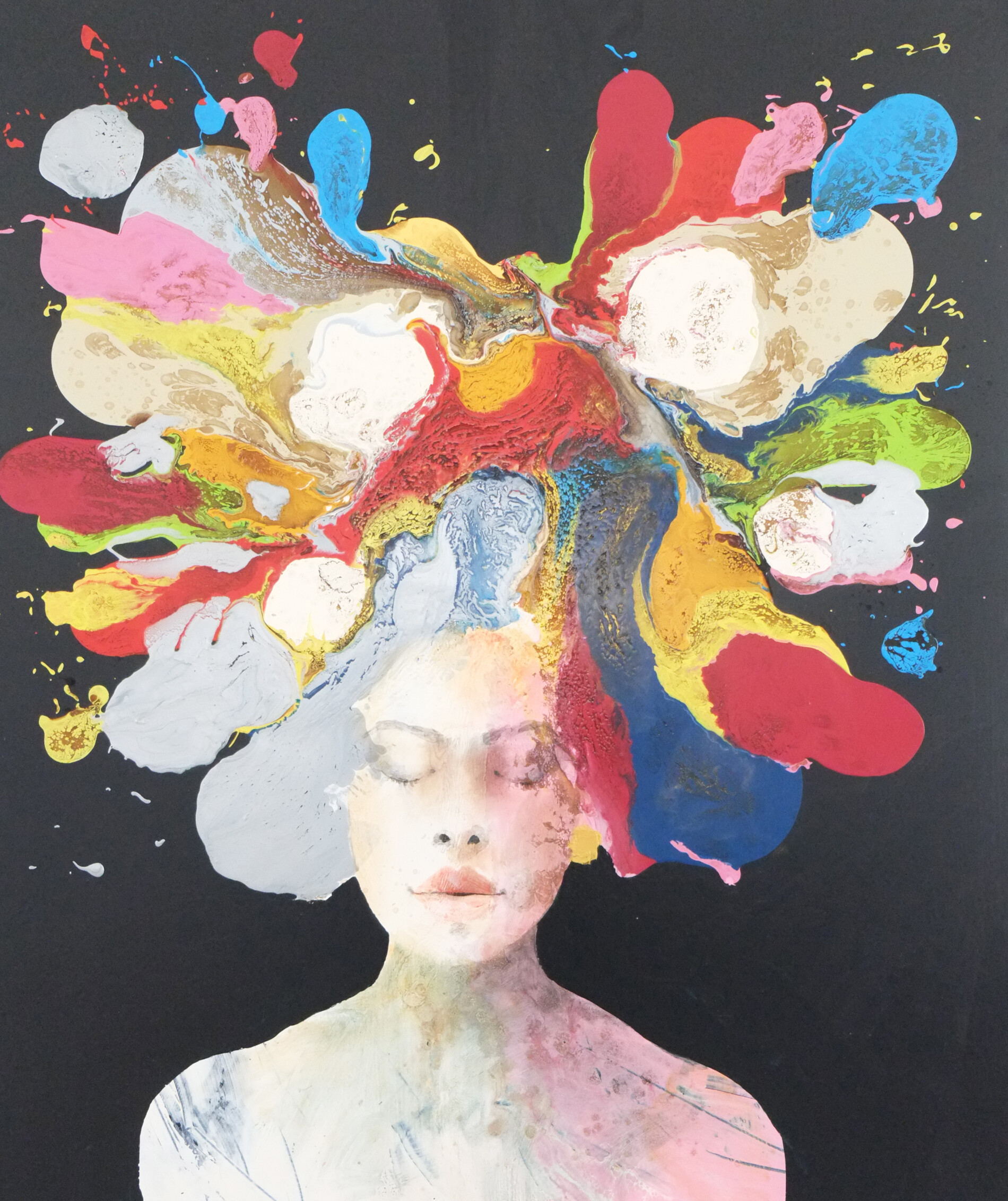 Un volto femminile, immerso nel nero profondo, sembra galleggiare in una quiete assoluta. Sopra di lei, il colore esplode senza esitazione: macchie vive, colature dense, contrasti accesi che si aprono come un lampo nella notte. In questo incontro tra buio e luce, Casetti lascia parlare il gesto: il colore diventa pensiero, impulso, emozione che prende forma e si espande oltre il volto, come un mondo interiore che non può restare nascosto.
