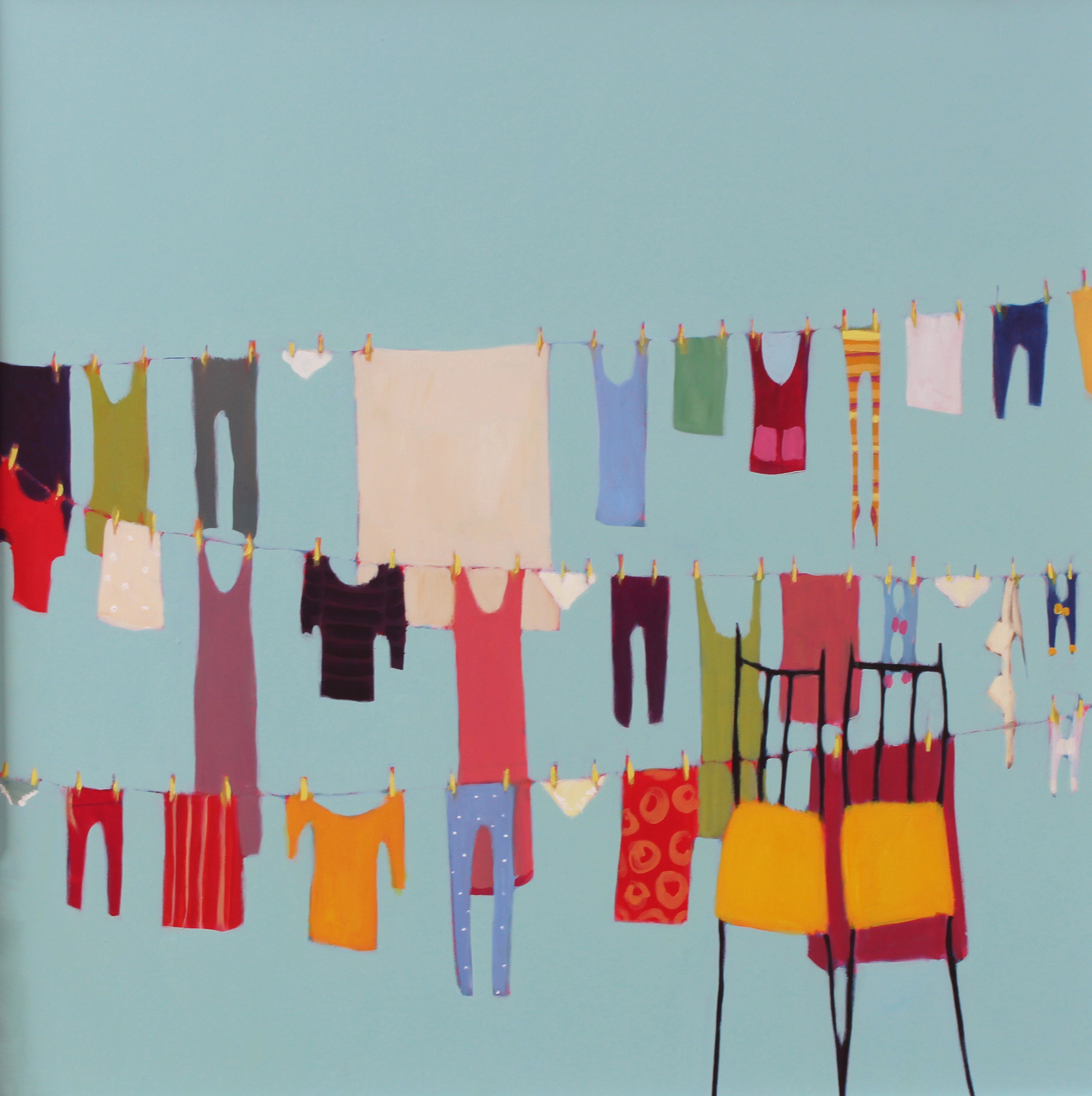 In questo grande quadro di Beth Richardson una sinfonia di forme e colori che delizia lo sguardo dello spettatore. In primo piano la coppia di seggioline gialle – vera e propria firma dell’artista – in fronte a tre file di colorati panni stesi ad asciguare. Una scena di quotidiana bellezza su un uniforme sfondo azzurro cielo.