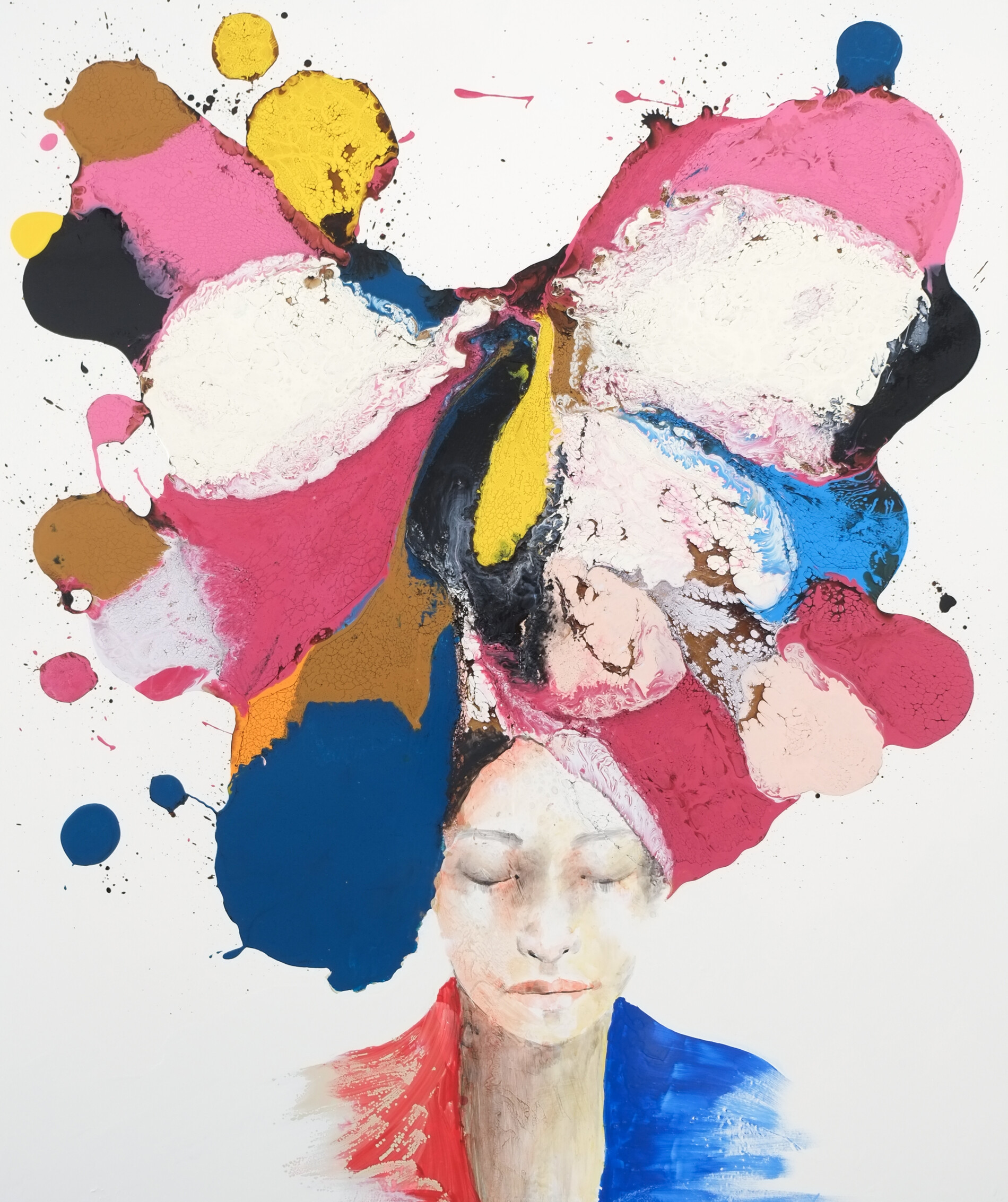 In quest’opera di grandi dimensioni, un volto in stato meditativo emerge come un punto di quiete da cui il colore si espande con energia istintiva. Nel contrasto tra la calma della figura e la vitalità del colore, Casetti dà forma al fluire dei pensieri e delle emozioni, trasformando la superficie in un campo visivo vivo e pulsante.