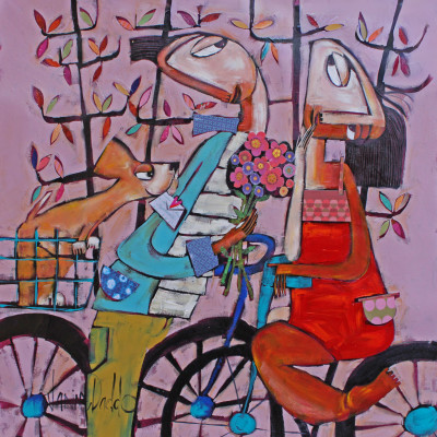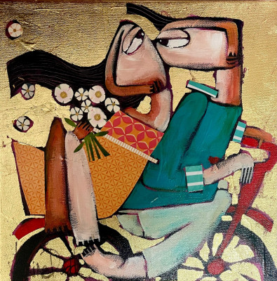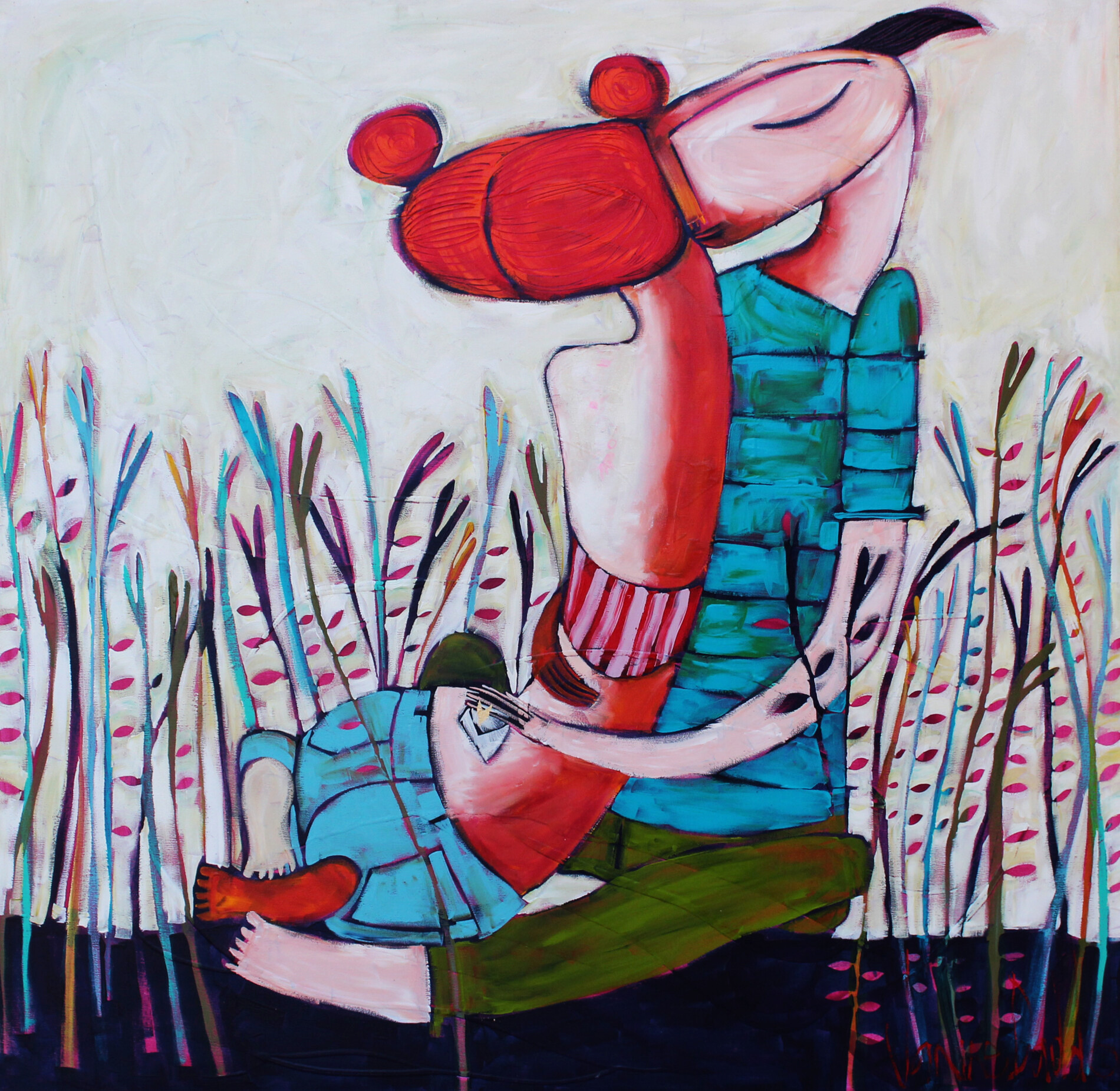 Un abbraccio profondo, che si trasforma in respiro, memoria e presenza. In Breathe you in, Janine Daddo celebra l’intimità del sentimento con una tavolozza calda e avvolgente, dove i rossi intensi e gli azzurri pastello dialogano con un fondo dorato di luce e armonia. I personaggi, stilizzati e teneramente intrecciati, raccontano la bellezza dell’amore quotidiano, fatto di piccoli gesti e grandi emozioni. Un’opera poetica e vibrante.