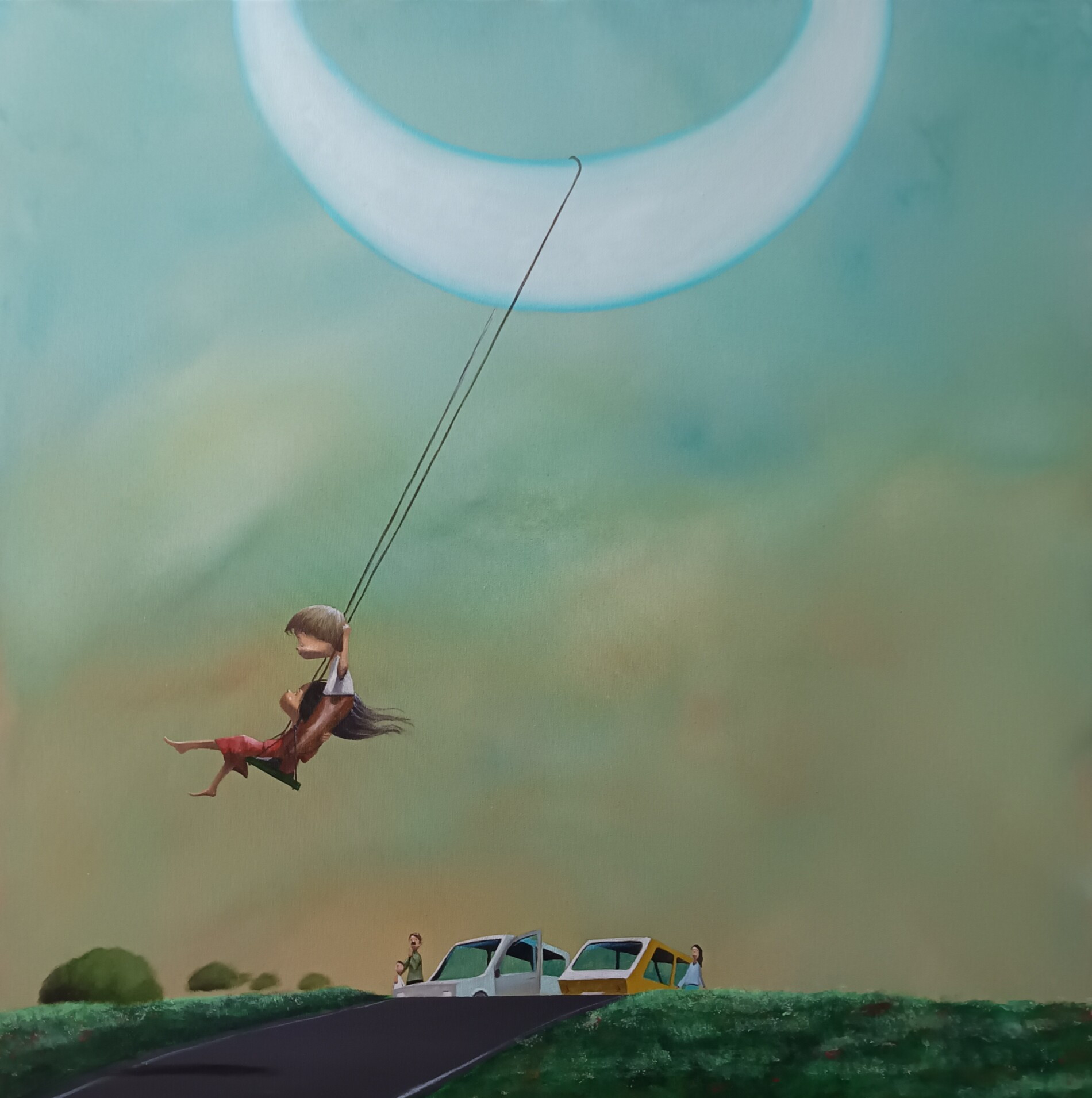 In quest’opera in olio su tela di Diego Santini, una bambina dondola sospesa verso una grande luna bianca, come se il cielo fosse parte integrante del gioco. Sotto di lei, una strada e poche auto sembrano appartenere a un mondo distante, incapace di contenere la leggerezza del suo volo. Il contrasto tra l’immensità del cielo e la quotidianità del mondo sottostante crea una scena in cui l’immaginazione diventa forza propulsiva, invitando lo spettatore a riscoprire quel momento in cui tutto sembra possibile e il meraviglioso è a portata di mano.
