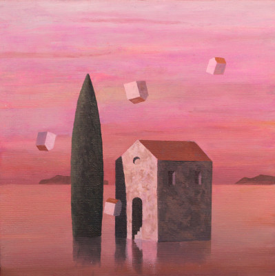 In questo olio su tela di medie dimensioni, una giovane donna lascia andare nell’aria una scia di lettere, come parole che cercano il loro posto nel mondo. Il gesto è lieve, delicato, quasi un soffio che libera ciò che nasce dentro di lei. Il paesaggio quieto che la circonda- il mare immobile, le isole lontane, il cielo compatto - amplifica il senso di calma e di attesa.