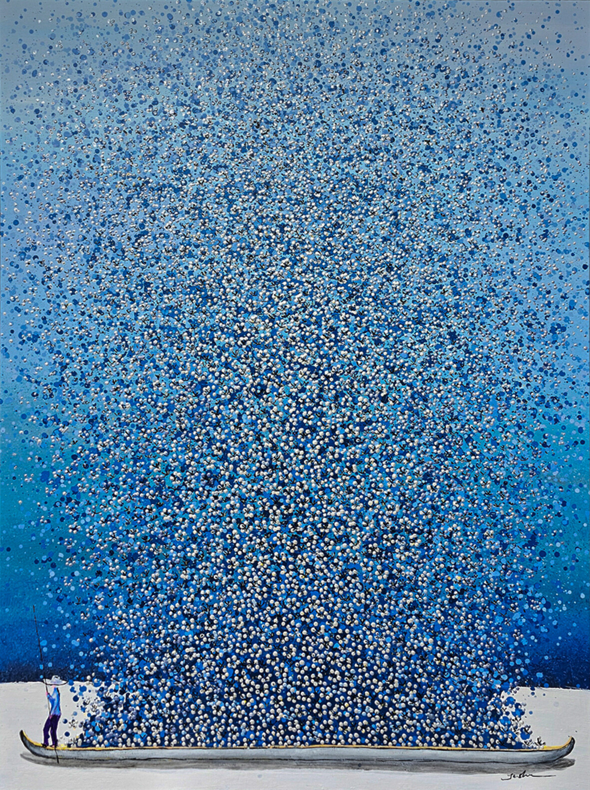 In quest’opera la barca, soggetto iconico di Je Shen, scivola silenziosa su uno specchio d’acqua immerso in un’esplosione di petali blu e argentei. La superficie nasce dal dialogo tra la lavorazione tradizionale dello sfondo e la fioritura costruita goccia dopo goccia con il contagocce, che dona profondità e una vibrazione quasi tridimensionale. L’effetto è sorprendente e immersivo: un’immagine di rara delicatezza che trasforma la scena in un momento di pura meraviglia e contemplazione.