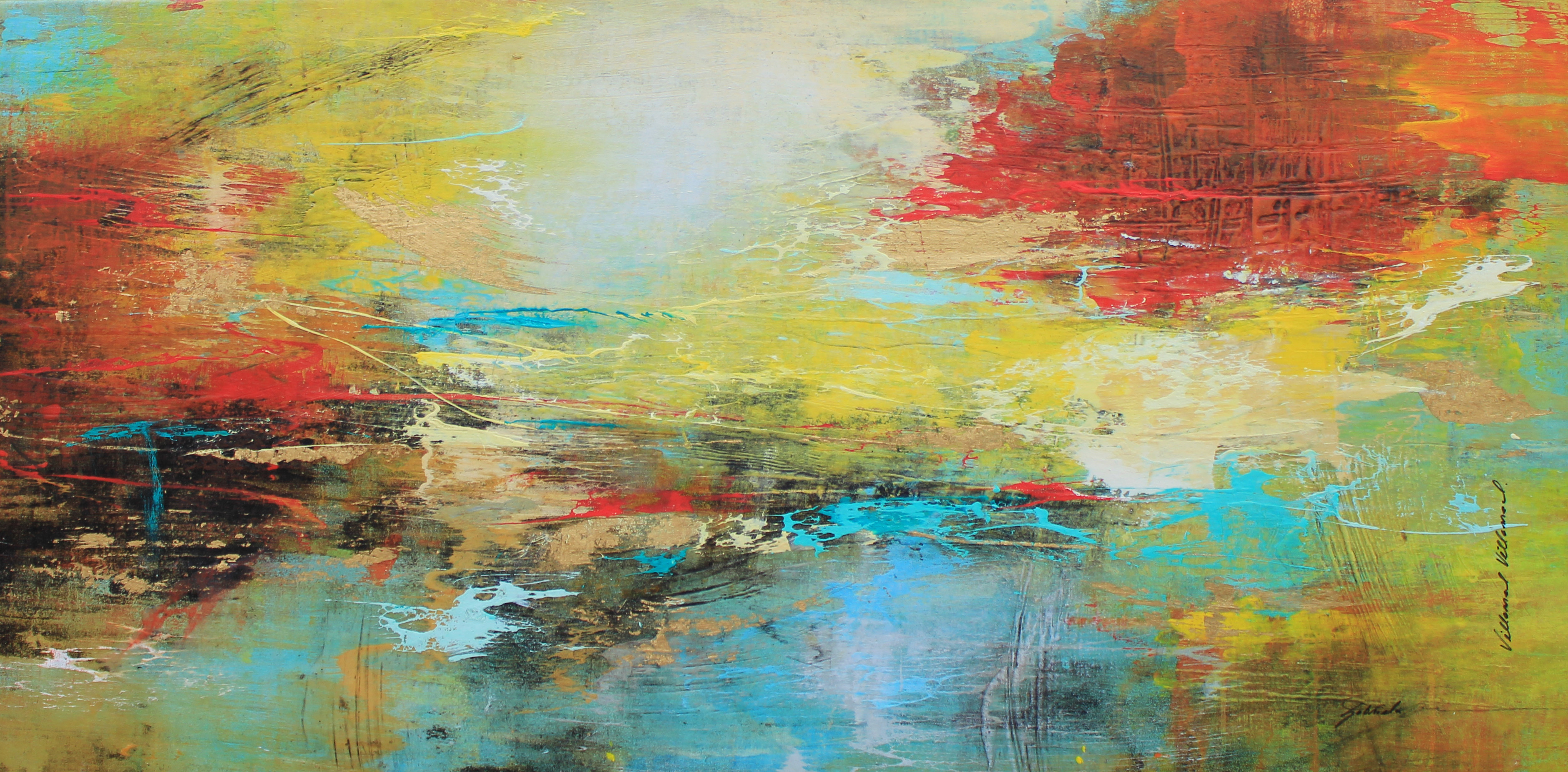 In questa tela le tonalità neutre e dorate si intrecciano a esplosioni di rosso e lampi di azzurro, creando una superficie vibrante e ricca di energia. L’approccio materico di Gabriela Villareal trasforma il colore in paesaggio, dando vita a un orizzonte immaginario dove i contrasti cromatici si armonizzano in un equilibrio raffinato.
