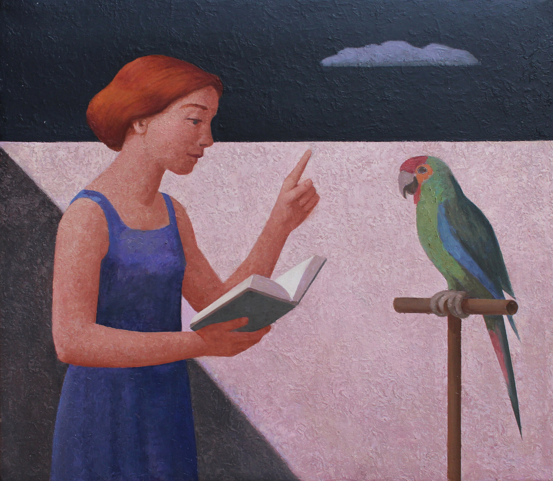 C’è un istante, sospeso tra silenzio e attesa, in cui una lezione sembra prendere forma. In questo olio su tela di medie dimensioni, Matthias Brandes mette in scena un dialogo inatteso tra una giovane donna e un pappagallo, come se entrambi fossero immersi in un apprendimento reciproco. Lei tiene aperto un libro, il dito sollevato in un gesto che unisce concentrazione e dolcezza; l’animale la osserva con serietà quasi umana, pronto a cogliere ogni sfumatura. Il fondo geometrico, diviso tra luce e ombra, avvolge la scena in un’atmosfera rarefatta, trasformando un gesto semplice in un momento di attenzione pura. Ogni elemento sembra trattenere il respiro, come se il tempo si fermasse per lasciare spazio alla sorpresa di questo incontro tanto improbabile quanto armonioso.