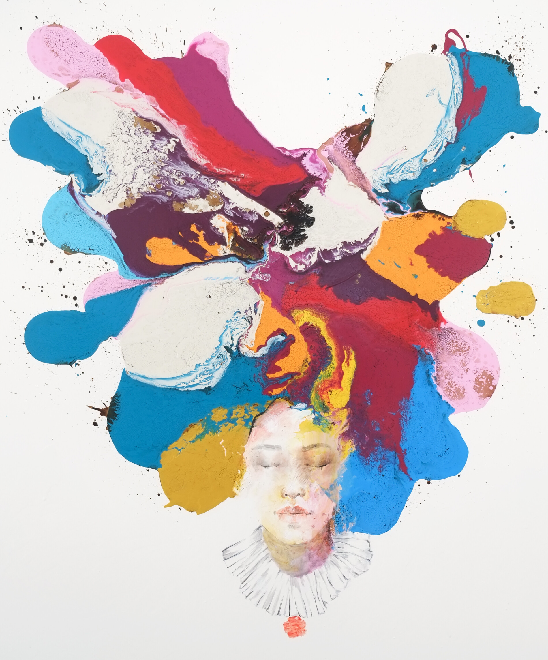 Il volto di una giovane donna emerge con delicatezza, accompagnato da campiture di colore materico in rosso, blu, ocra e rosa. Le variazioni cromatiche e la luminosità dello sfondo bianco donano all’opera un carattere sospeso, quasi onirico. Una composizione che unisce interiorità e libertà espressiva in un equilibrio sottile e affascinante.