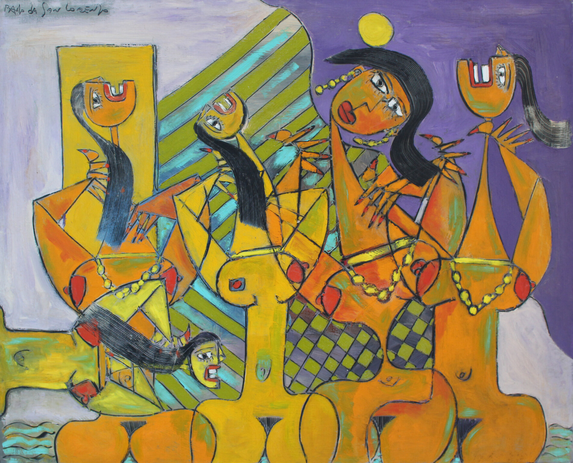 L'opera "Bagnanti" di Paolo da San Lorenzo è un'esplosione di energia e movimento, in cui il corpo umano diventa puro flusso di forme. Le figure delle bagnanti sono stilizzate e frammentate, ma al contempo emanano un forte senso di vitalità e ritmo. La composizione, caratterizzata da una tecnica pittorica stratificata e materica, cattura il dinamismo attraverso una sapiente gestione del colore.Le tonalità vivaci, come il viola, l’arancio e il giallo, vibrano sulla tela, creando un contrasto che amplifica la sensazione di movimento. I contorni sono netti e definiti, grazie all’uso dell’incisione nera, che accentua la fluidità e l'energia delle danzatrici. Con questo dipinto olio su tela, Paolo da San Lorenzo celebra l'emozione e la forza del corpo in movimento, trasformando un topos dell’arte occidentale in un linguaggio visivo che parla direttamente all’anima.