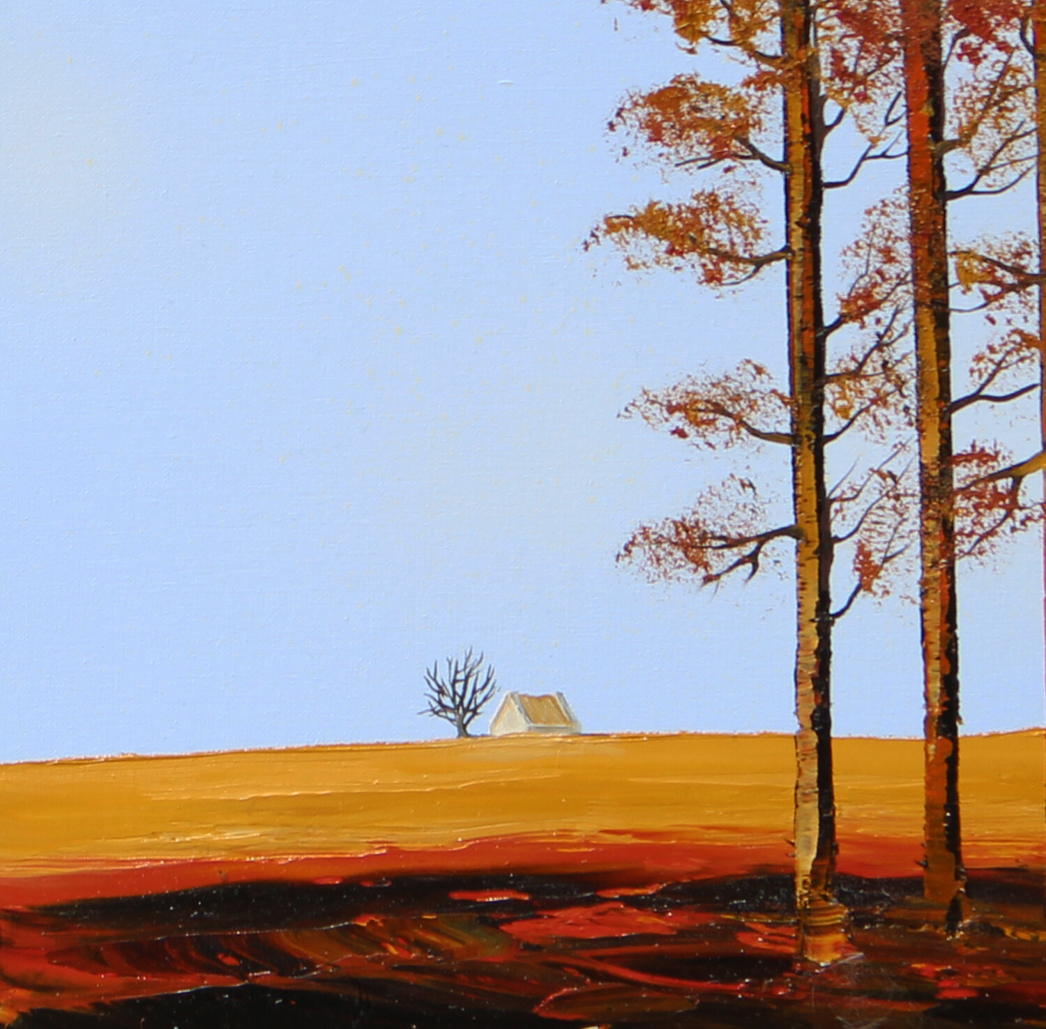 L'autunno prende vita in questa piccola pittura, dove alberi dai colori caldi e terra dorata creano una sensazione di mutamento stagionale. Il paesaggio è arricchito da sfumature di arancio e marrone che dominano il terreno, contrastando con il cielo azzurro. Il piccolo formato rende l'opera ancora più intima, invitando l'osservatore a riflettere sulla transizione naturale tra le stagioni.