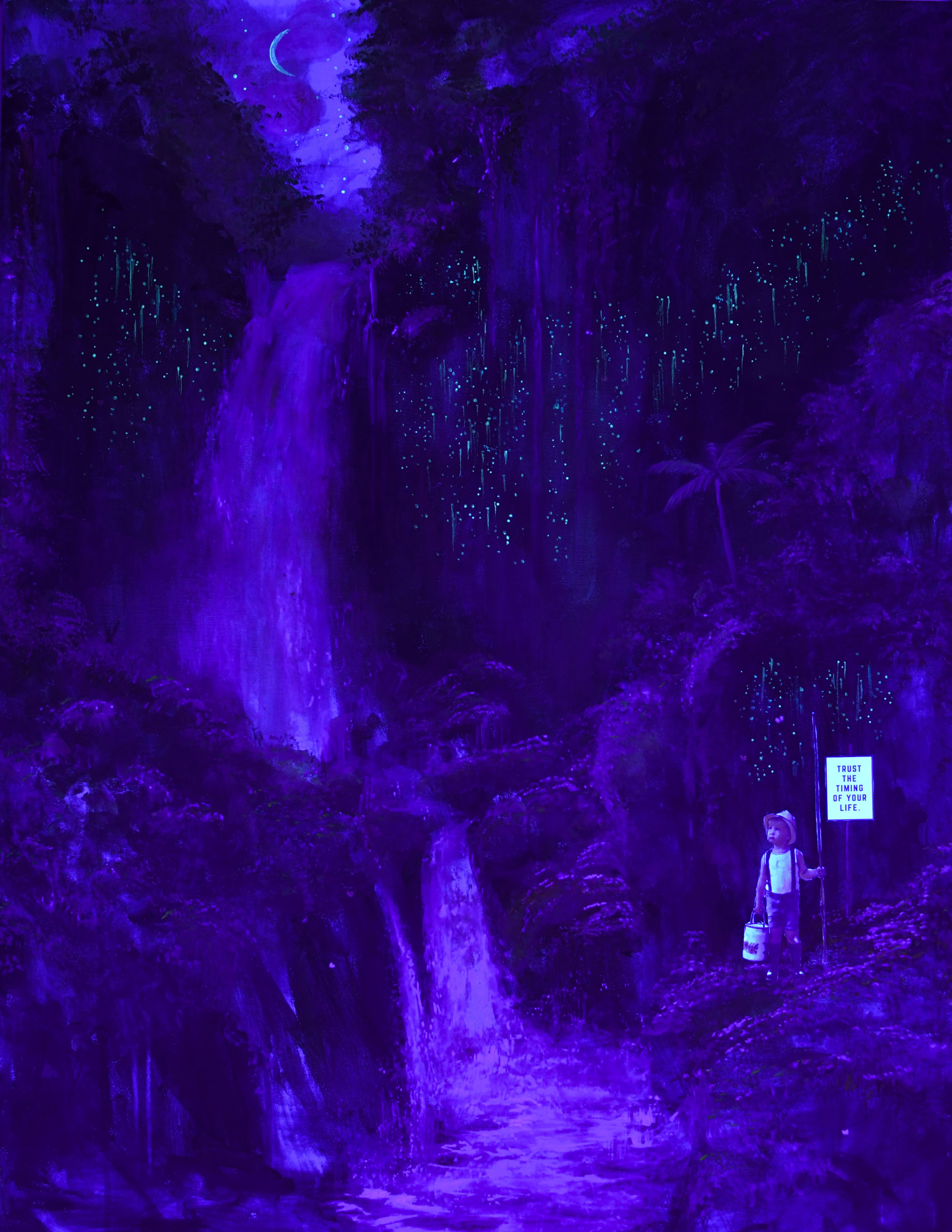 La tecnica distintiva di Veronica Green è la pittura a tripla scena, sviluppata durante una residenza allo Château Orquevaux nel 2020, che impiega luce naturale, luce ultravioletta (UV) e materiali fosforescenti per svelare tre livelli di significato distinti ma interconnessi all'interno di ogni opera. Attraverso questo processo, Green attraversa con eleganza il visibile e l'invisibile, guidando gli spettatori tra mondi di presentazione esterna, rivelazione subconscia e introspezione trascendentale. In un paesaggio lussureggiante attraversato da una cascata, un bambino osserva la natura con meraviglia; accanto a lui, un cartello recita: “Trust the timing of your life”. Home unisce pittura figurativa e astrazione luminosa, dove la fosforescenza apre dimensioni nascoste, trasformando la scena in un invito a fidarsi del proprio percorso.