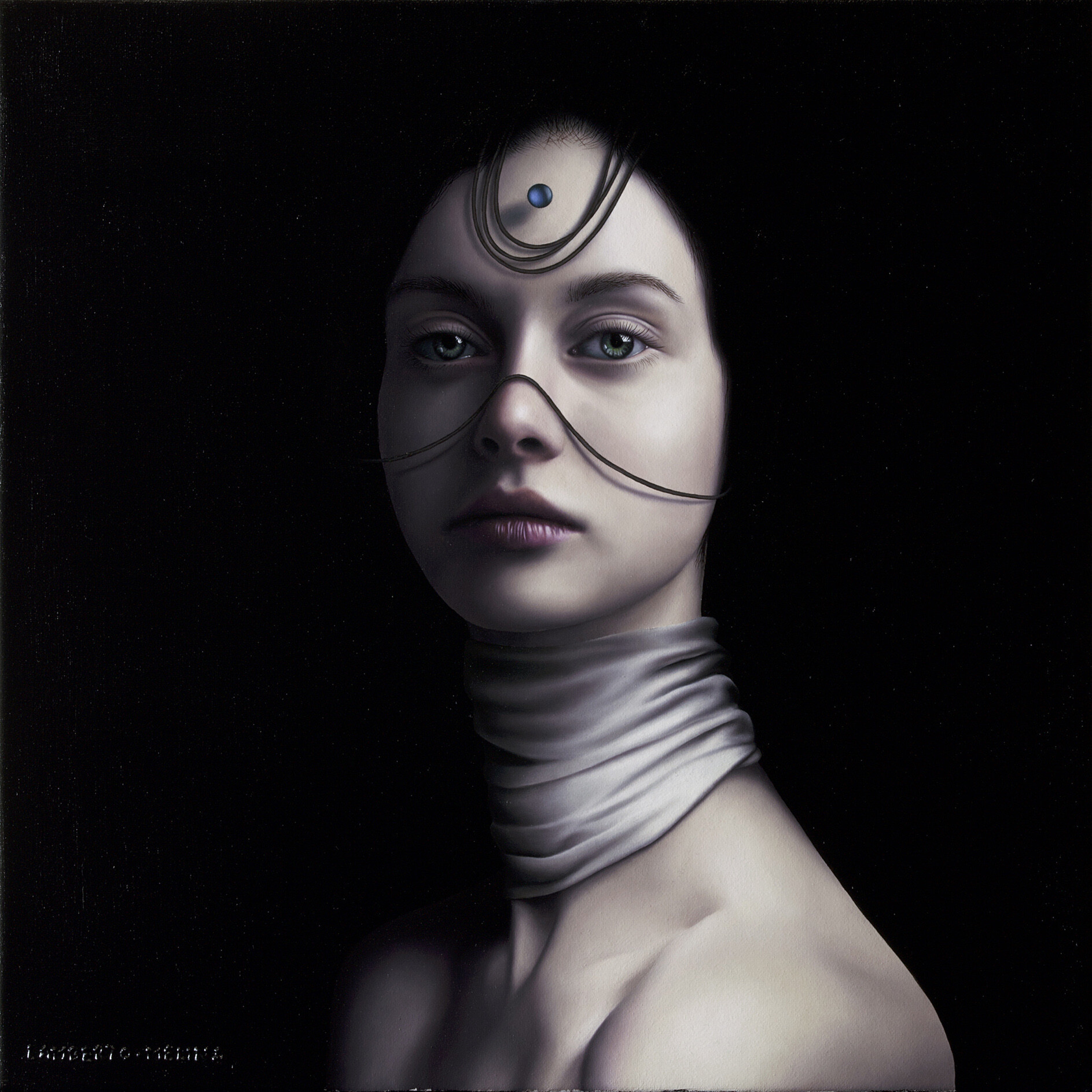 Uno sguardo penetrante, al tempo stesso fragile e potente, ci interroga dal buio. "Ajna vide adhuc" è un’opera a olio su tela dove Lamberto Melina indaga la dimensione spirituale e interiore dell’essere umano. Il volto femminile emerge da uno sfondo nero assoluto, adornato da sottili linee che richiamano simboli esoterici e un terzo occhio che apre a mondi invisibili. L’artista fonde realismo ipnotico e simbolismo contemporaneo, creando un ritratto denso di energia silenziosa e introspezione.
