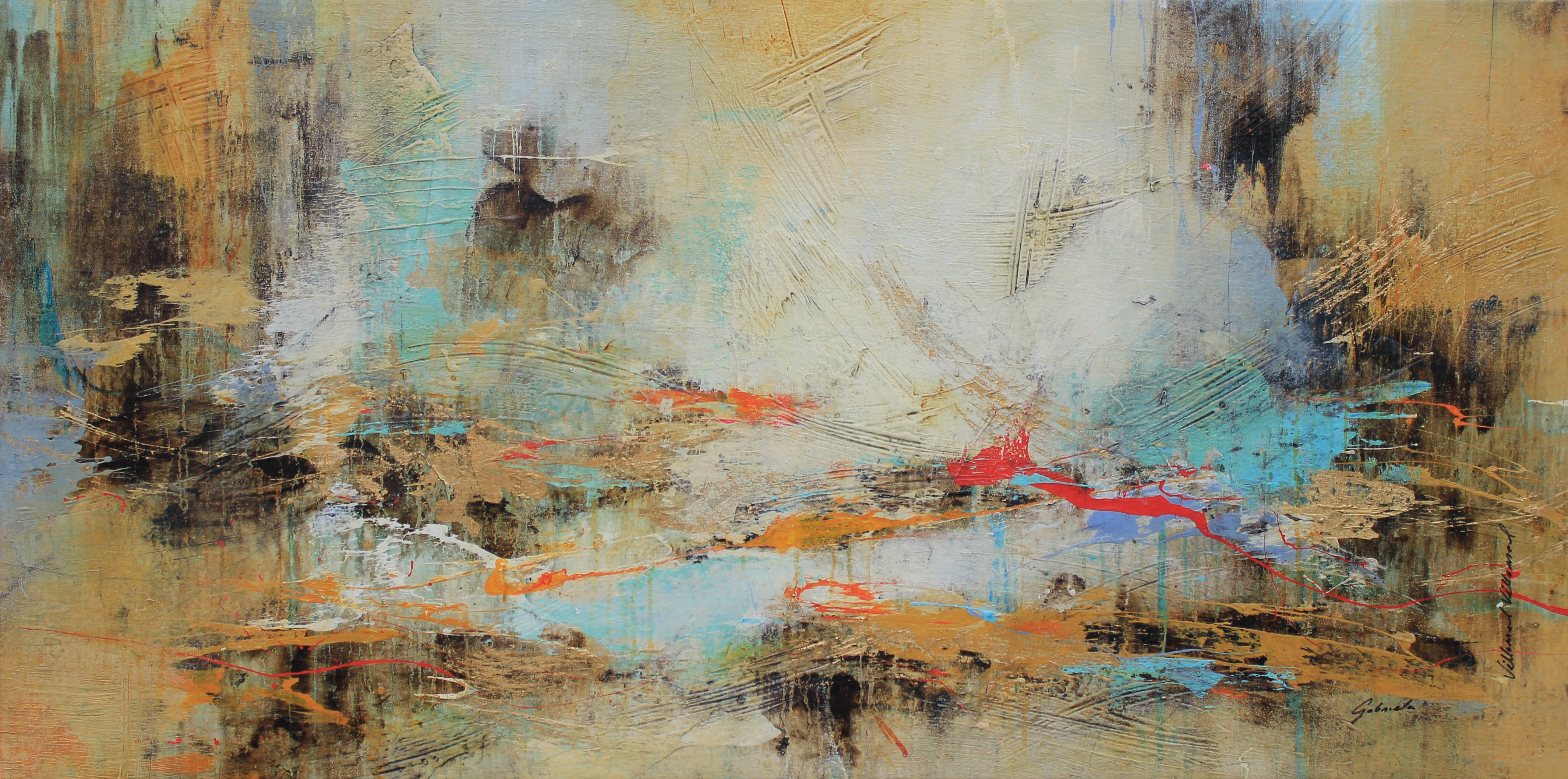 Con toni che spaziano dal grigio argento al rame e al rosso fuoco, questa opera rivela l’abilità di Gabriela Villareal nel creare paesaggi astratti dal forte impatto visivo. Le colature e le stratificazioni acriliche generano profondità e movimento, mentre i contrasti cromatici evocano la forza primordiale della natura.