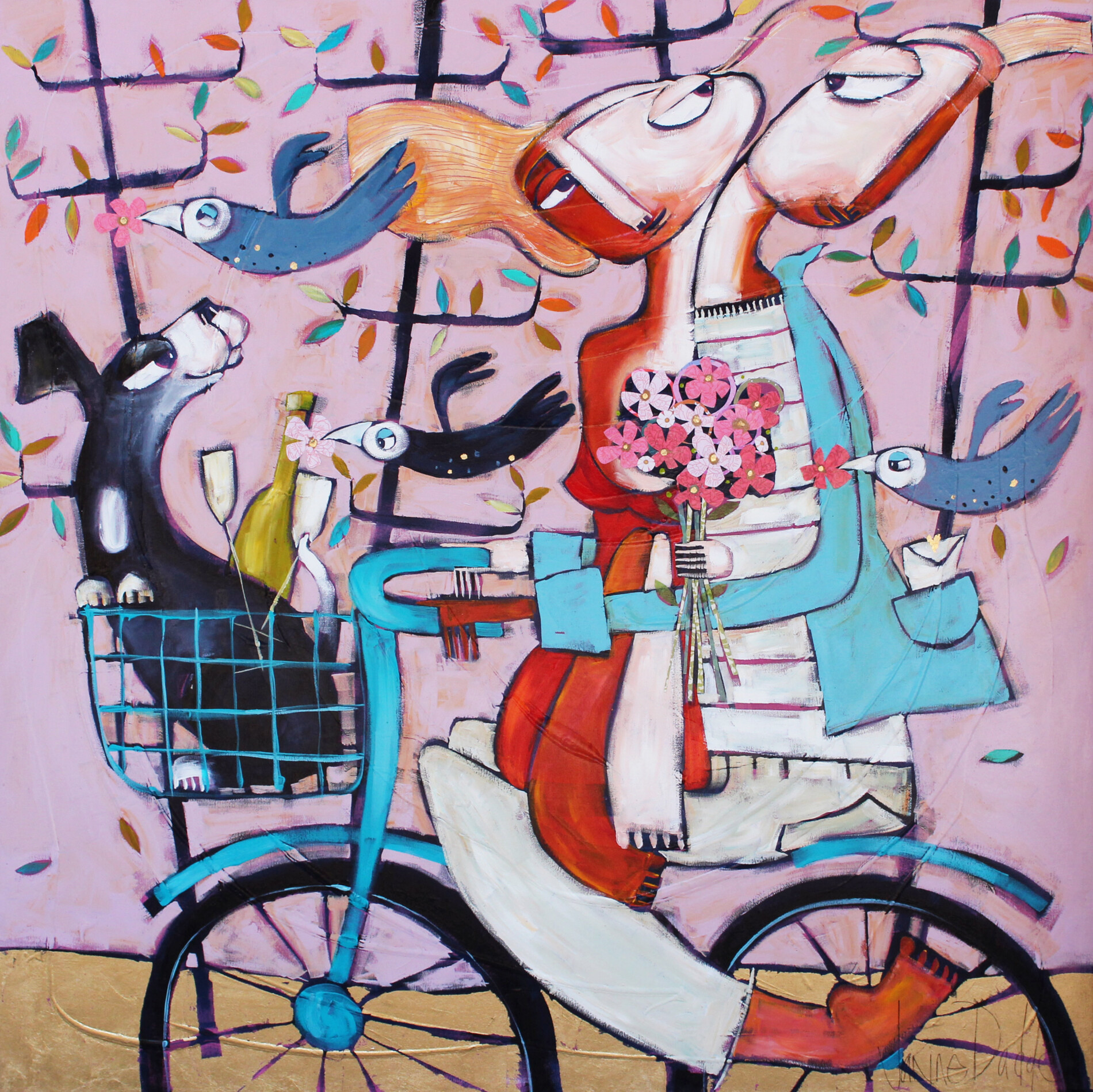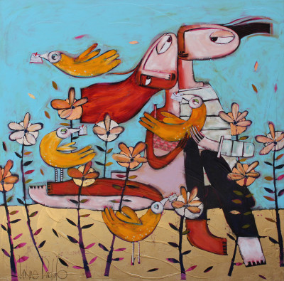 In un giardino incantato dove i fiori si trasformano in uccelli messaggeri d’amore, The flower birds è un inno alla meraviglia e alla delicatezza. Janine Daddo costruisce un universo tenero e immaginifico in cui ogni dettaglio vibra di gioia e stupore. I personaggi, stilizzati ma pieni di espressività, abitano una scena floreale dai colori accesi: turchesi, rossi, rosa e tocchi dorati rendono l’opera luminosa e festosa. Un tributo alla fantasia e alla potenza della gentilezza quotidiana.