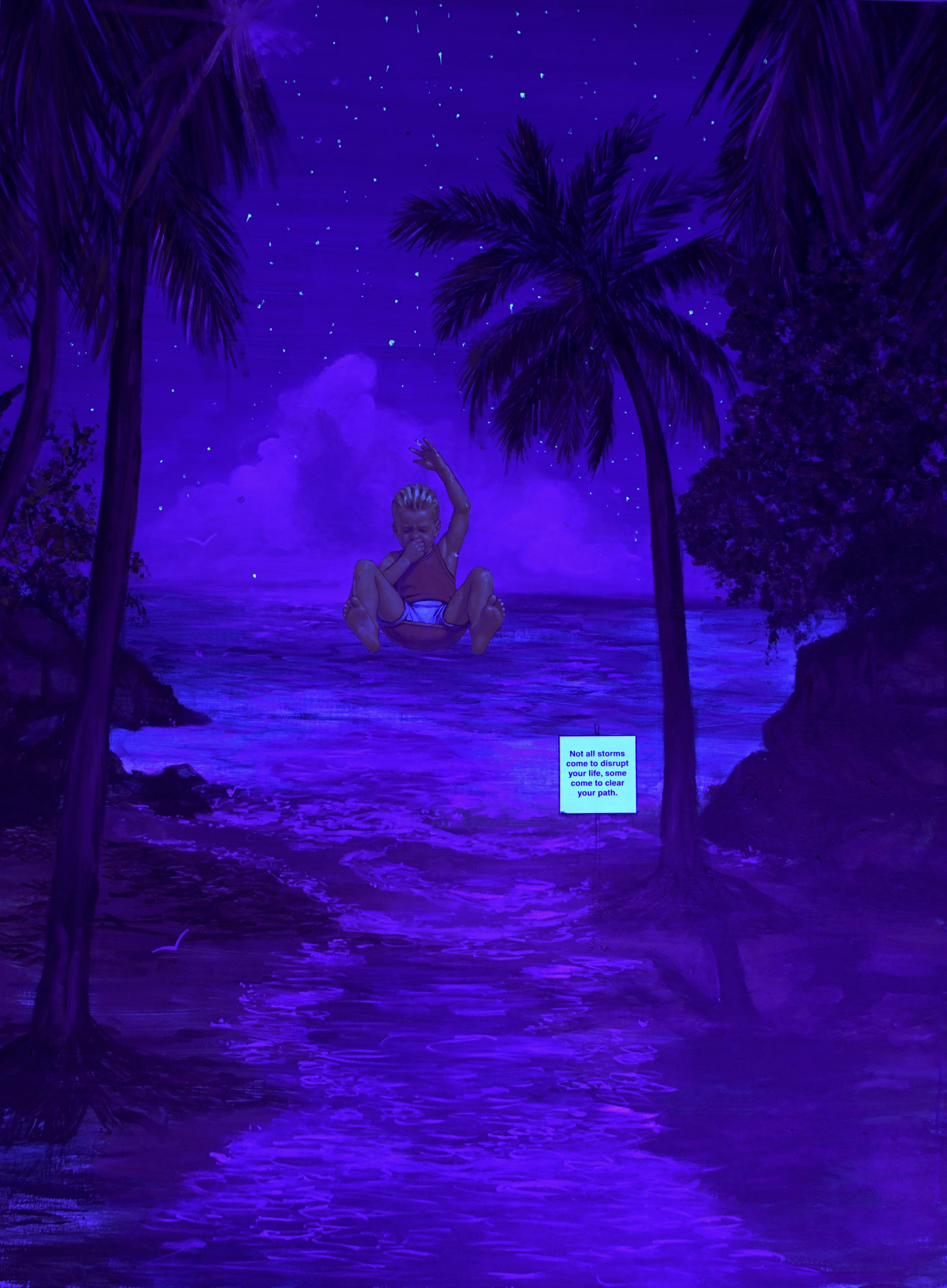 Una visione giocosa e acquatica, dove macchie vivaci sembrano affiorare da un lago mentale. Alla luce naturale, “Splash” è un inno all’energia primordiale del colore e alla dimensione giocosa dell'infanzia; sotto UV, compaiono dettagli fluorescenti che suggeriscono riflessi notturni e vibrazioni emotive. Al buio, l’opera esplode di luce propria, trasformandosi in un universo liquido e interiore, dove lo spettatore si immerge come in un sogno lucido.