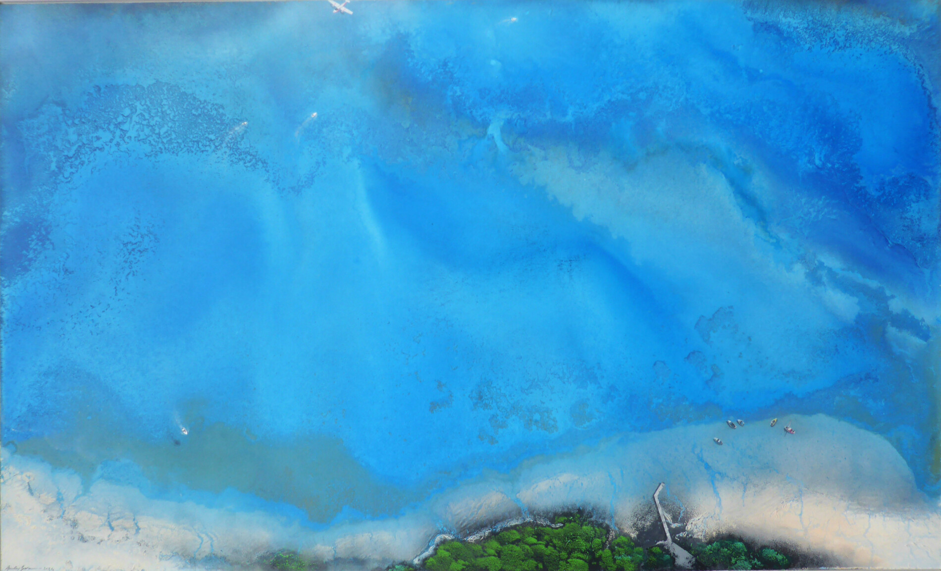 Una spiaggia silenziosa si distende ai margini di un mare trasparente, quasi irreale. Le sfumature delicate e i pochi dettagli sospesi danno forma a una visione rarefatta, dove l’assenza diventa racconto. Tra grana pittorica e velature acquatiche, affiorano il respiro del vento e l’eco salmastra dell’oceano.