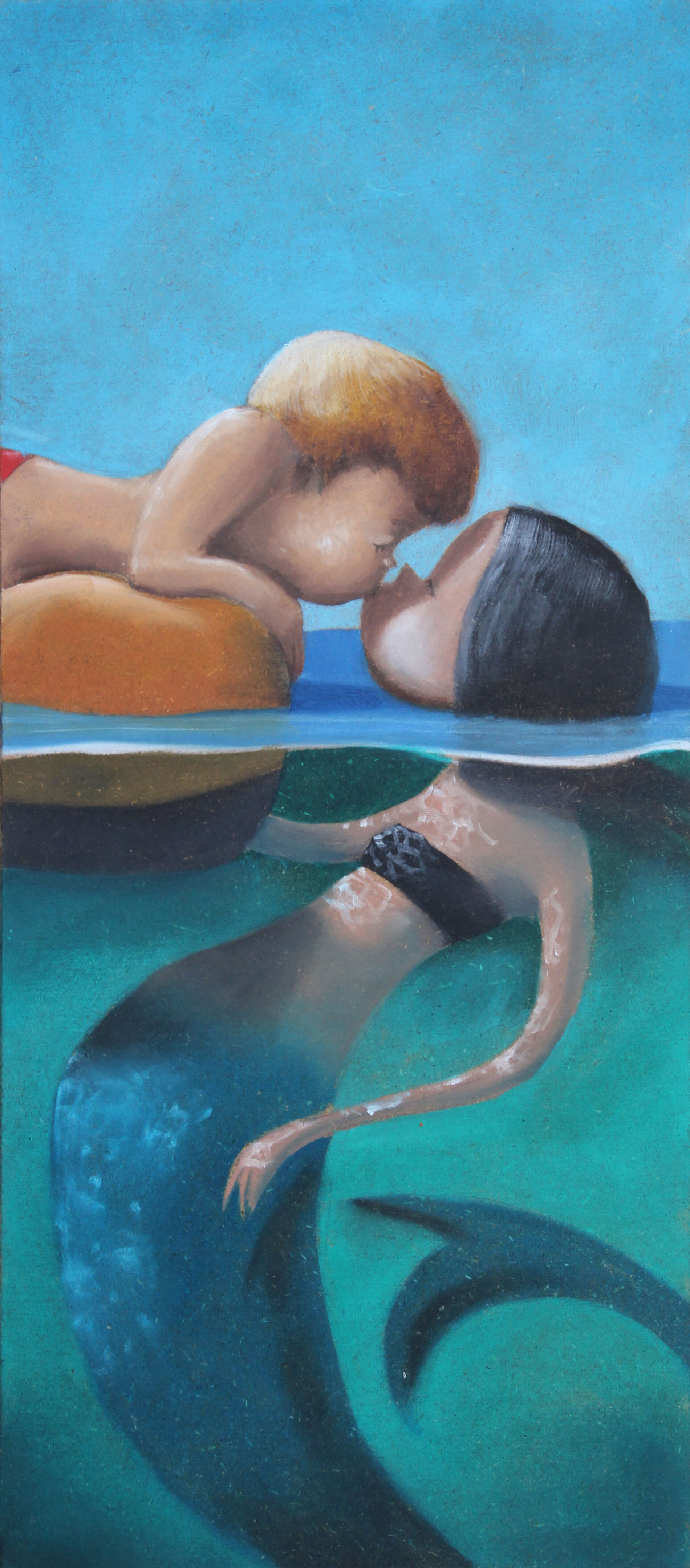 Sospeso tra mare e fantasia, un bacio unisce due mondi: in superficie, un bambino si sporge dolcemente dal suo salvagente, mentre sotto l’acqua emerge la figura inattesa e affascinante di una giovane sirena. L’incontro avviene sulla sottile linea tra realtà e immaginazione, dove tutto sembra possibile e il mare diventa custode di un segreto tenero e sorprendente.