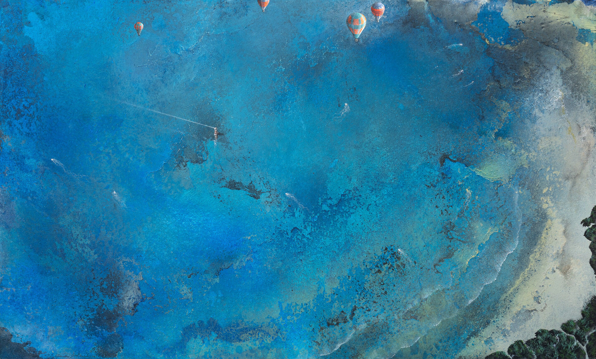 Un aereo attraversa un cielo rarefatto, specchiandosi in acque appena increspate. La prospettiva zenitale trasmette un senso di sospensione e silenzio. Le trasparenze cromatiche, unite a inserti materici, creano un paesaggio mentale in cui l’orizzonte si dissolve