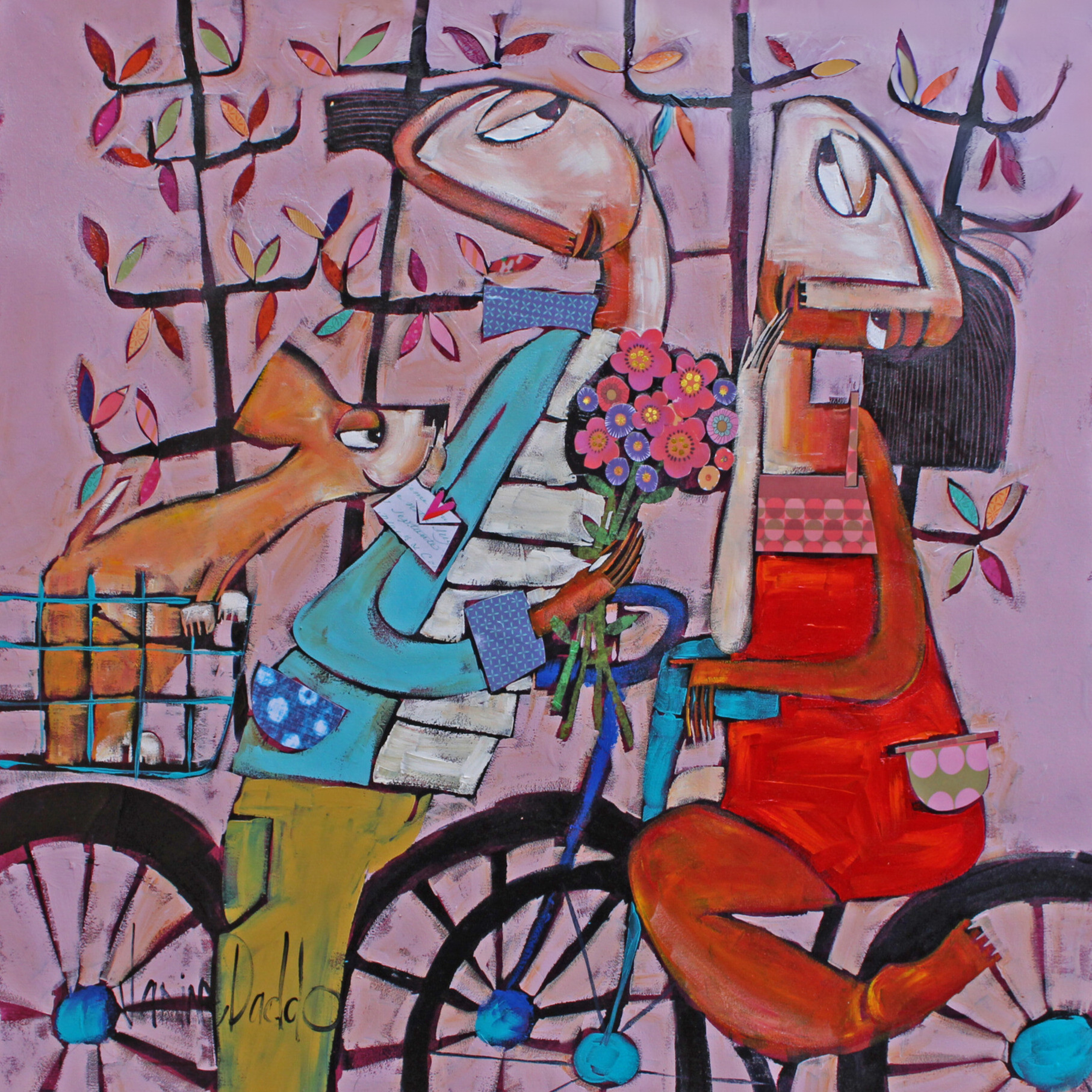 Un'esplosione poetica di colore e sentimento. In Love you, Janine Daddo ci regala un microcosmo romantico dove due figure, immerse in un paesaggio fiorito, si scambiano uno sguardo pieno di dolcezza. I toni del rosso, del rosa e dell’azzurro si fondono in una composizione armonica e vibrante, raccontando la semplicità e l’intensità dell’amore.