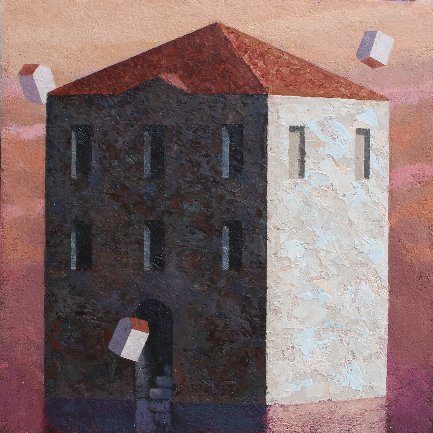 Una casa solitaria si staglia su uno sfondo rosato, divisa tra luce e ombra come se custodisse due stati dell’essere. Le superfici, lavorate con una materia pittorica densa e stratificata, rivelano la tipica tecnica di Brandes: spatolate minute, texture rugose, colori calibrati che conferiscono alle architetture un carattere sospeso e quasi scultoreo. In questo dipinto di piccole dimensioni l’artista trasforma così un’immagine essenziale in un momento di quieta introspezione, dove l’architettura diventa metafora di un rientro intimo, verso ciò che ci appartiene e ci accoglie.